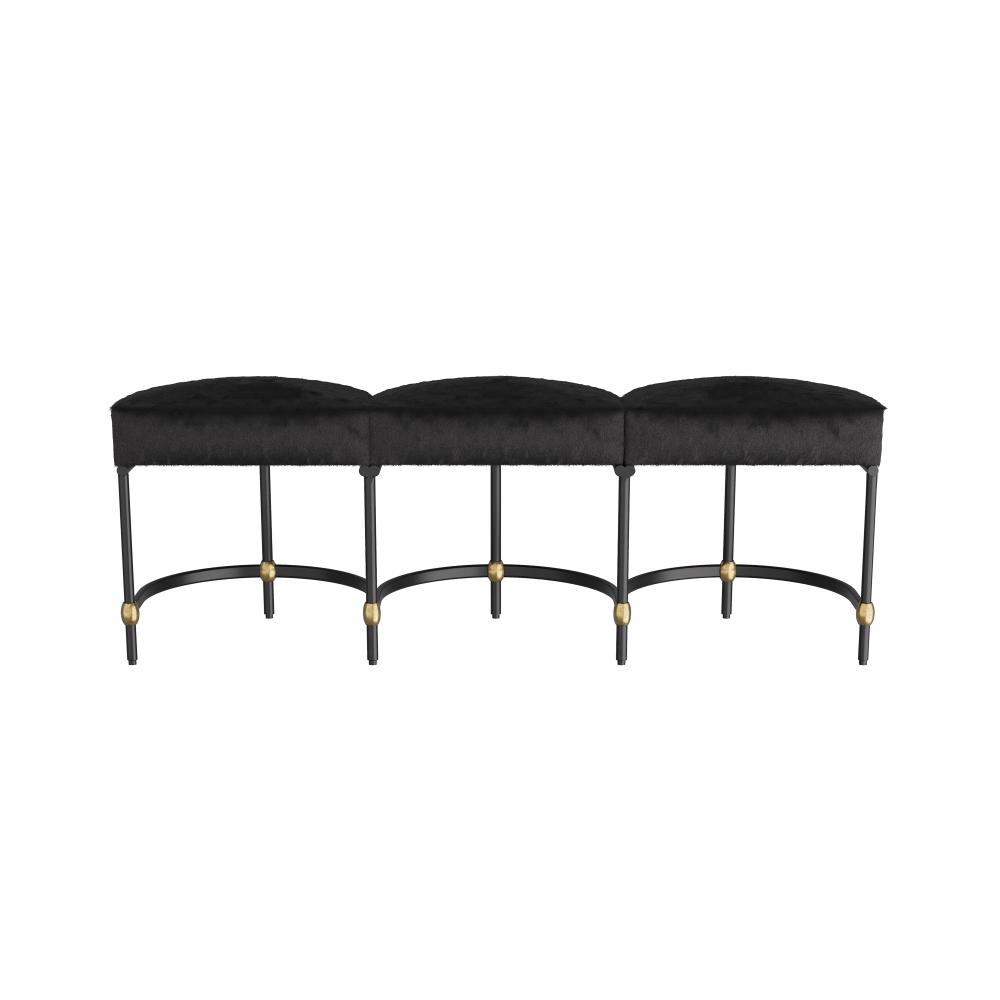 The streamlined forms and repetitive patterns of Art Deco influence this bench. A trio of black hair-on-hide seats perch atop blackened bronze finished stainless steel legs with added elements of antique brass details, providing elegance from every angle. Hide will vary.