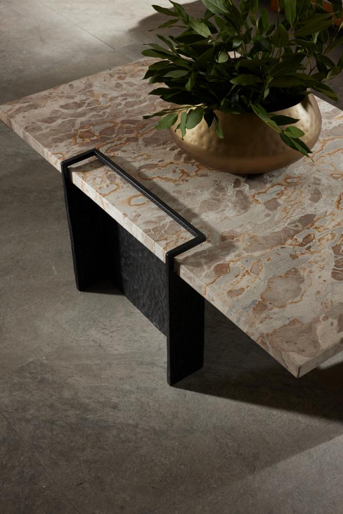 A refined mix of materials makes an intriguing pairing in a naturally textured marble and laser-cut iron Boda cocktail table. Three intersecting planes of textured blackened iron "float" a capri marble top, resulting in a surprisingly ethereal effect. Finish will vary.