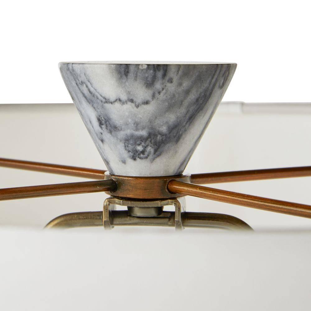 Crafted from our new faux galaxy marble, the sculptural shape of this slender resin lamp is inspired by turned wooden spindles. The totemic form’s smaller footprint allows it for placement in tighter spaces or display it in pairs. Bronze harp and matching finial. Off-white microfiber drum shade. Finish will vary.