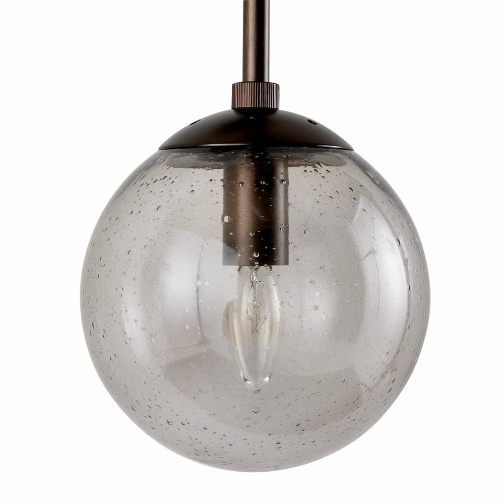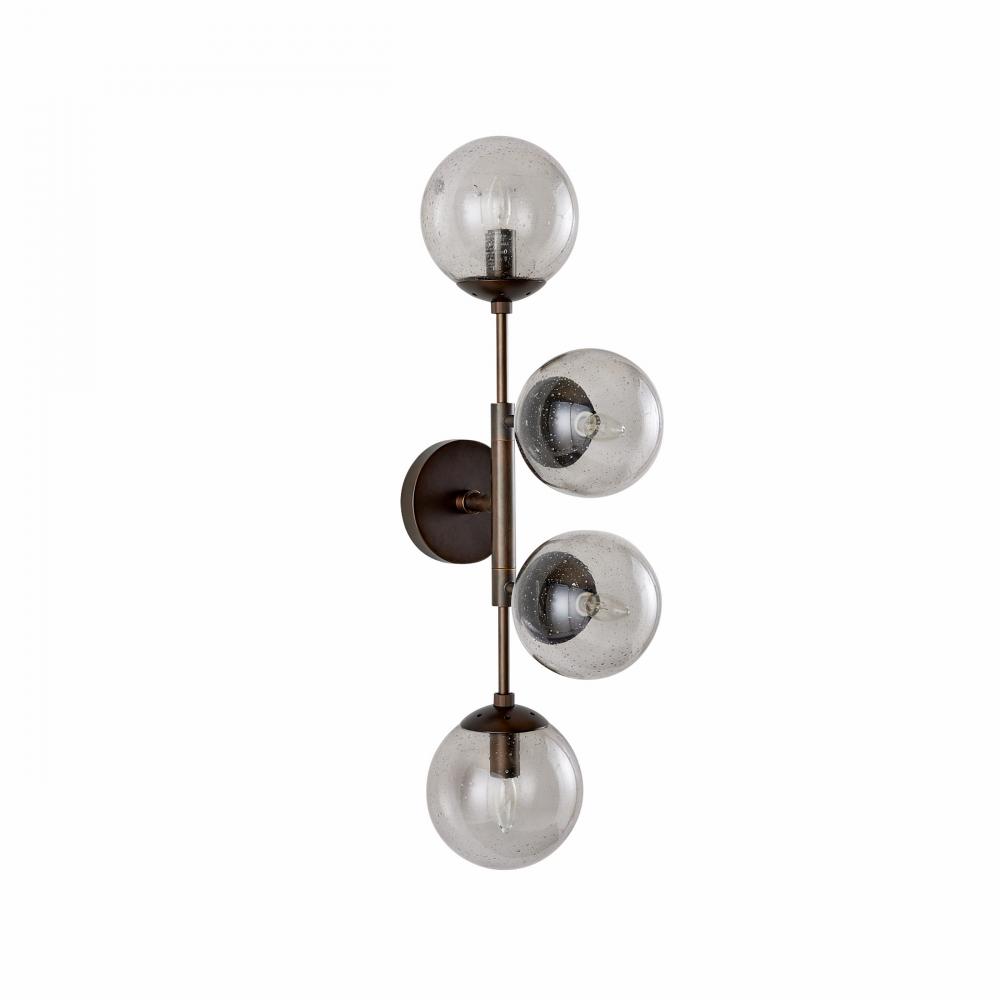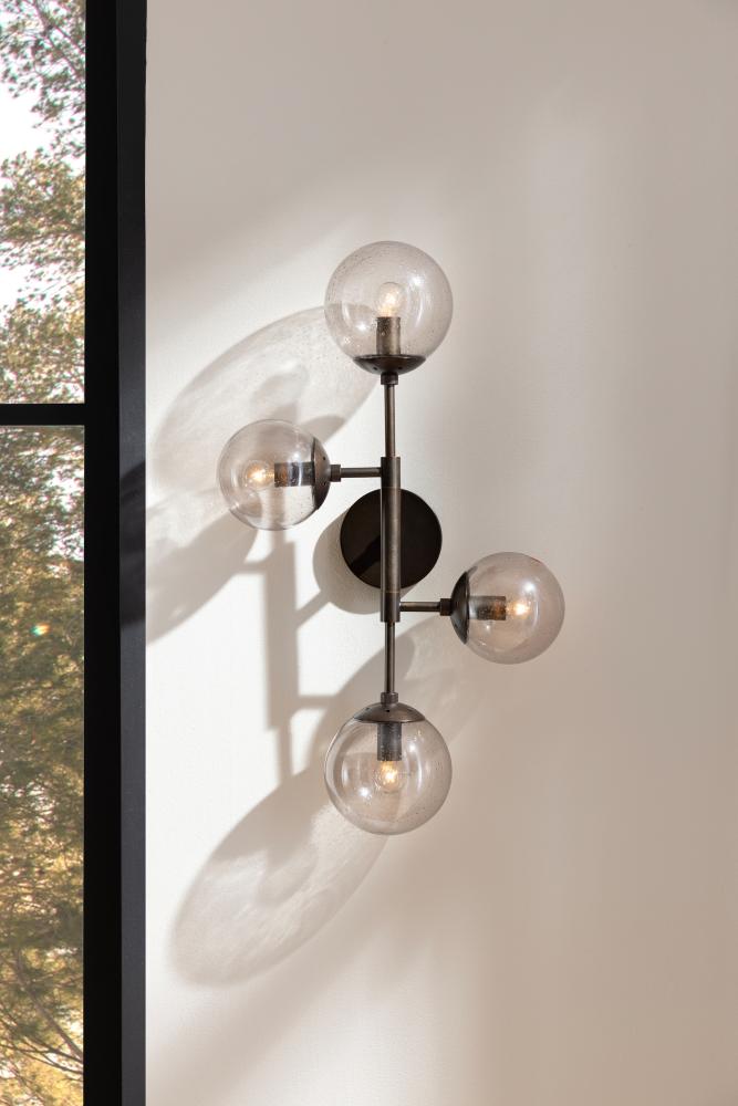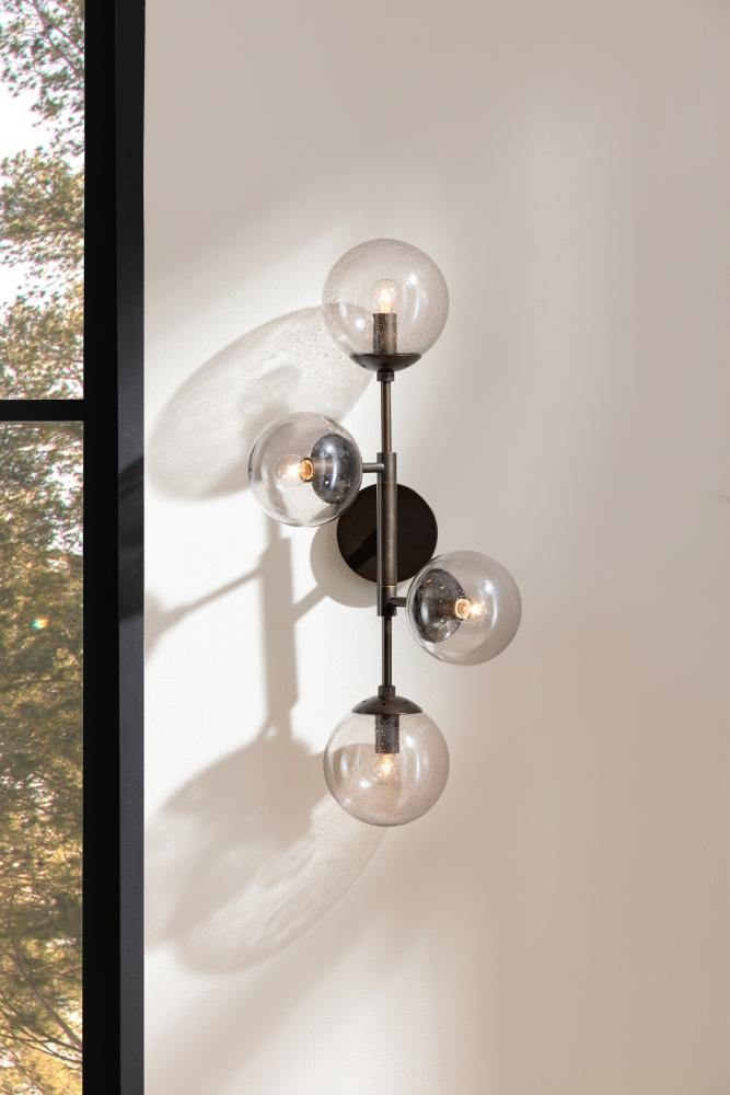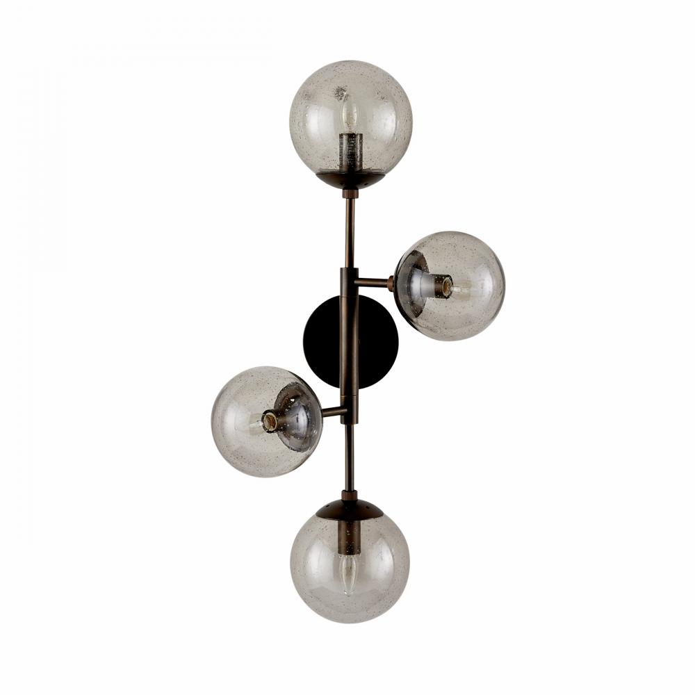 Like celestial bodies, a quartet of smoke seedy glass globes orbit an axis of English bronze-plated steel. Articulated arms allow Christelle to easily rotate, allowing for a striking mirrored effect. Hang this impactful style horizontally or vertically, alone or in multiples. Finish will vary.