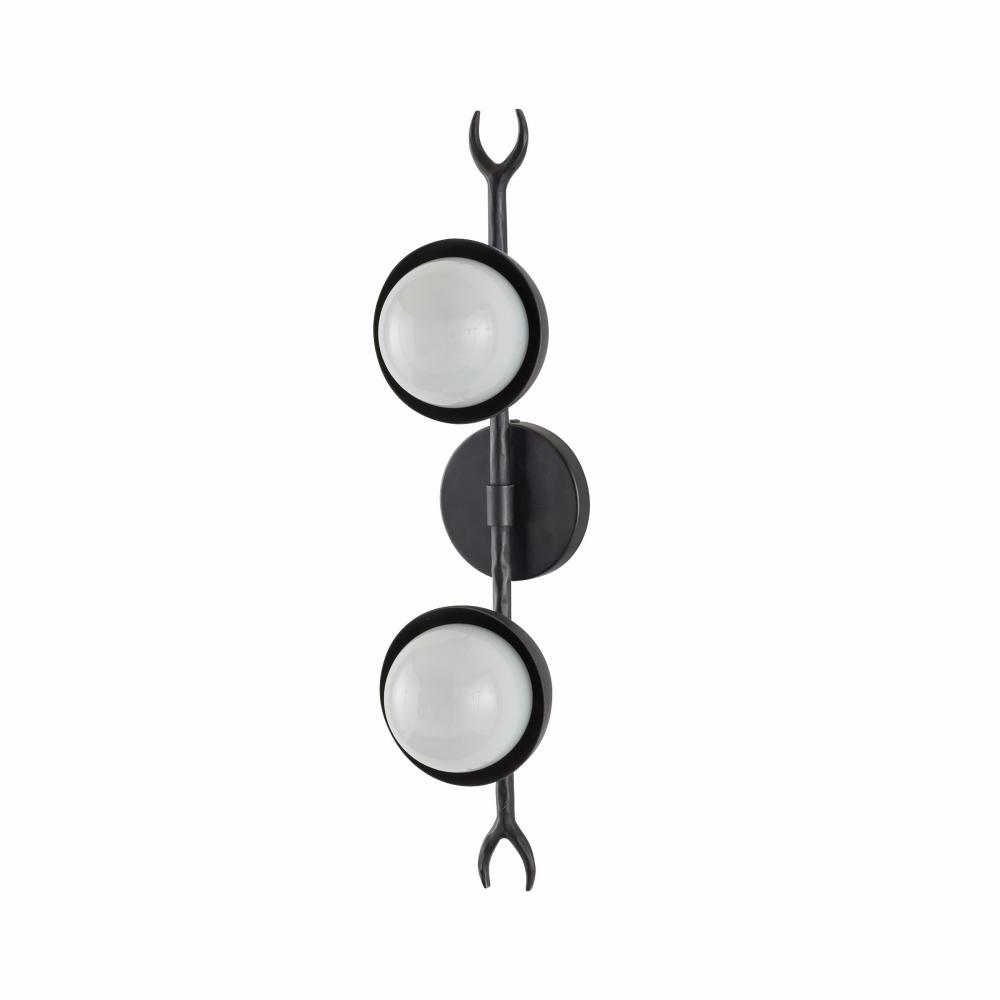 Arms and armory inform the sharp angles of our spear-like sconce. Designed to be hung vertically or horizontally, the hammered blackened iron backplate extends to gently cup double globes of frosted glass. Finish will vary.