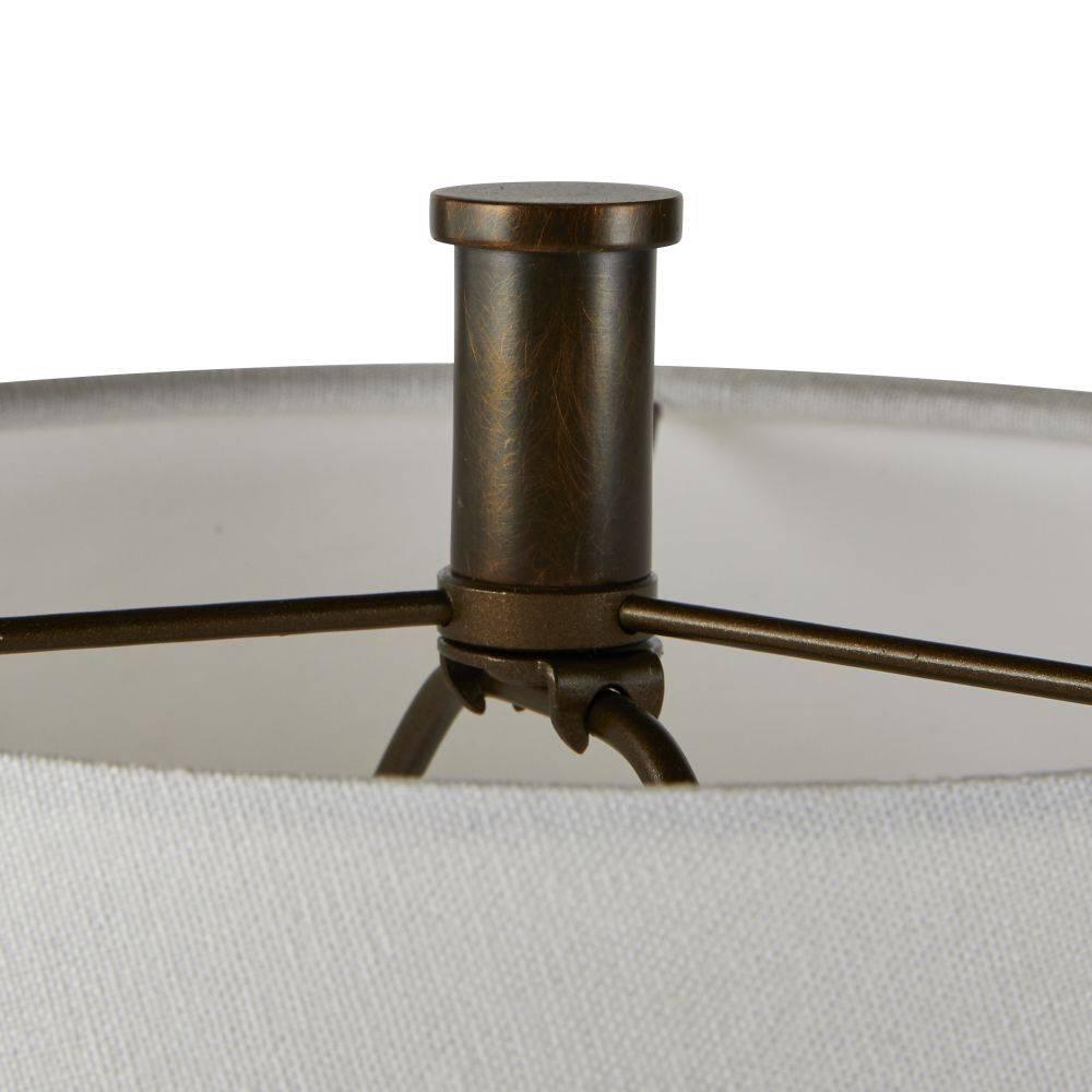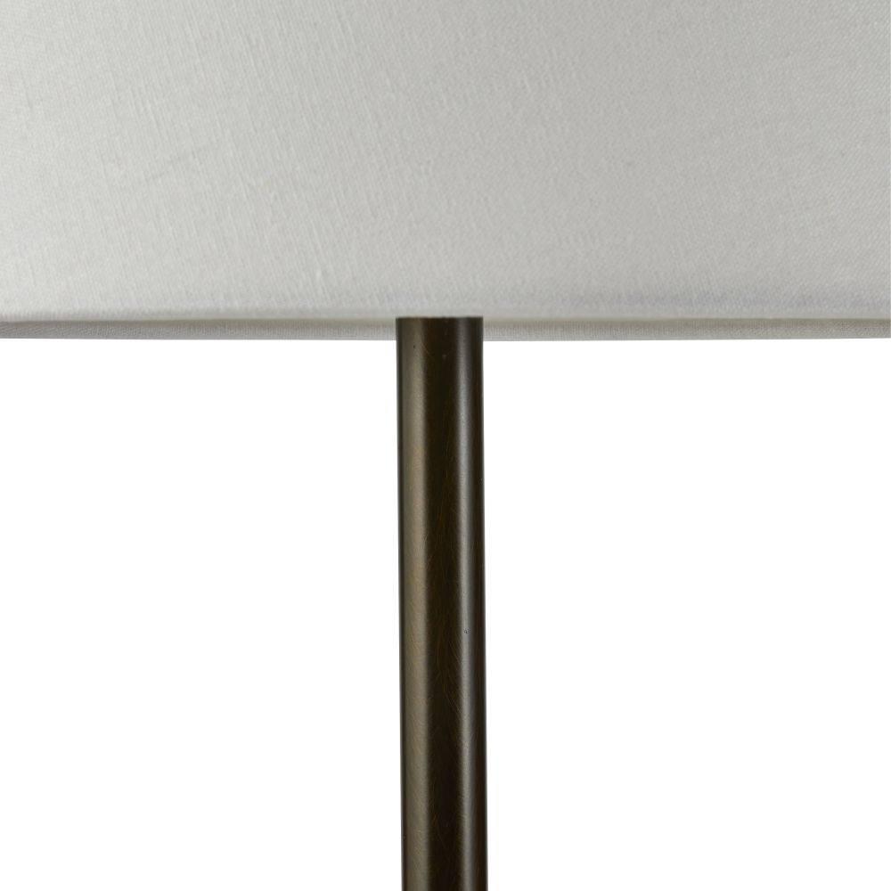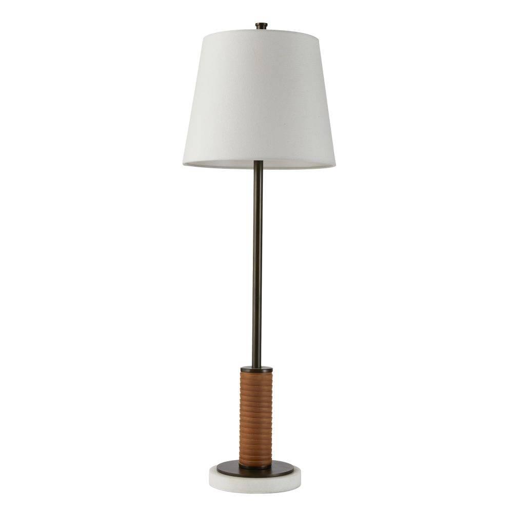 Fine cognac leatherworking and a taller silhouette makes the Conway ideal for a gentleman’s lounge, console, or buffet. Both masculine and modern, this English bronze frame is anchored to a base of white marble for a sophisticated contrast. White linen drum shade and taupe cloth cord.