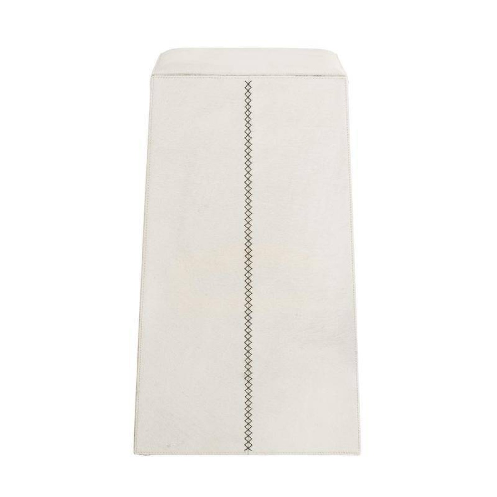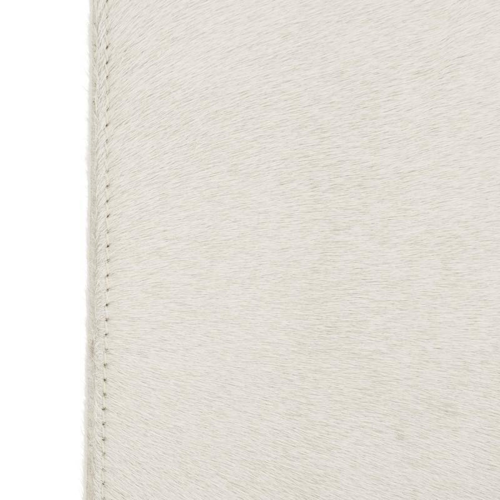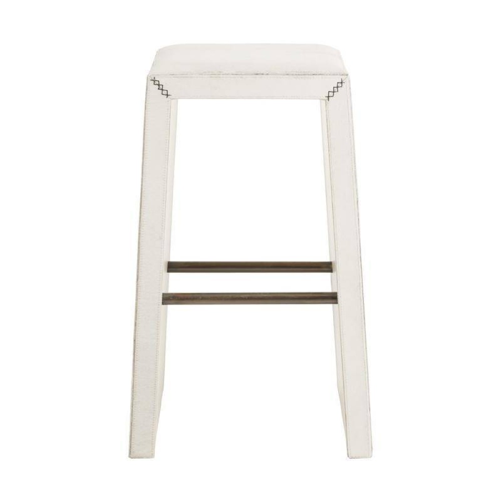 Crafted of white hair-on-hide, this backless bar stool is a tactile delight. A mitered whipstitch creates a racing stripe down the center of each side, while slim antique brass bridges add contrast and support to this minimal design. Hide will vary.