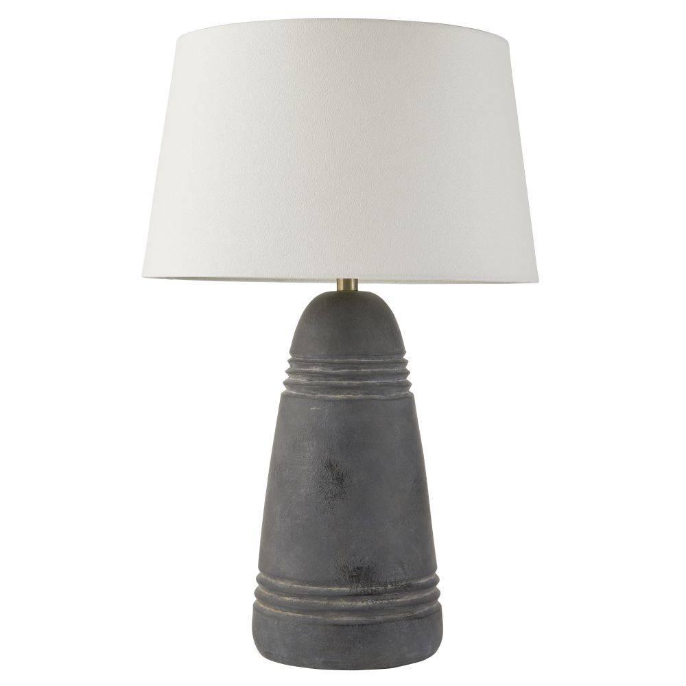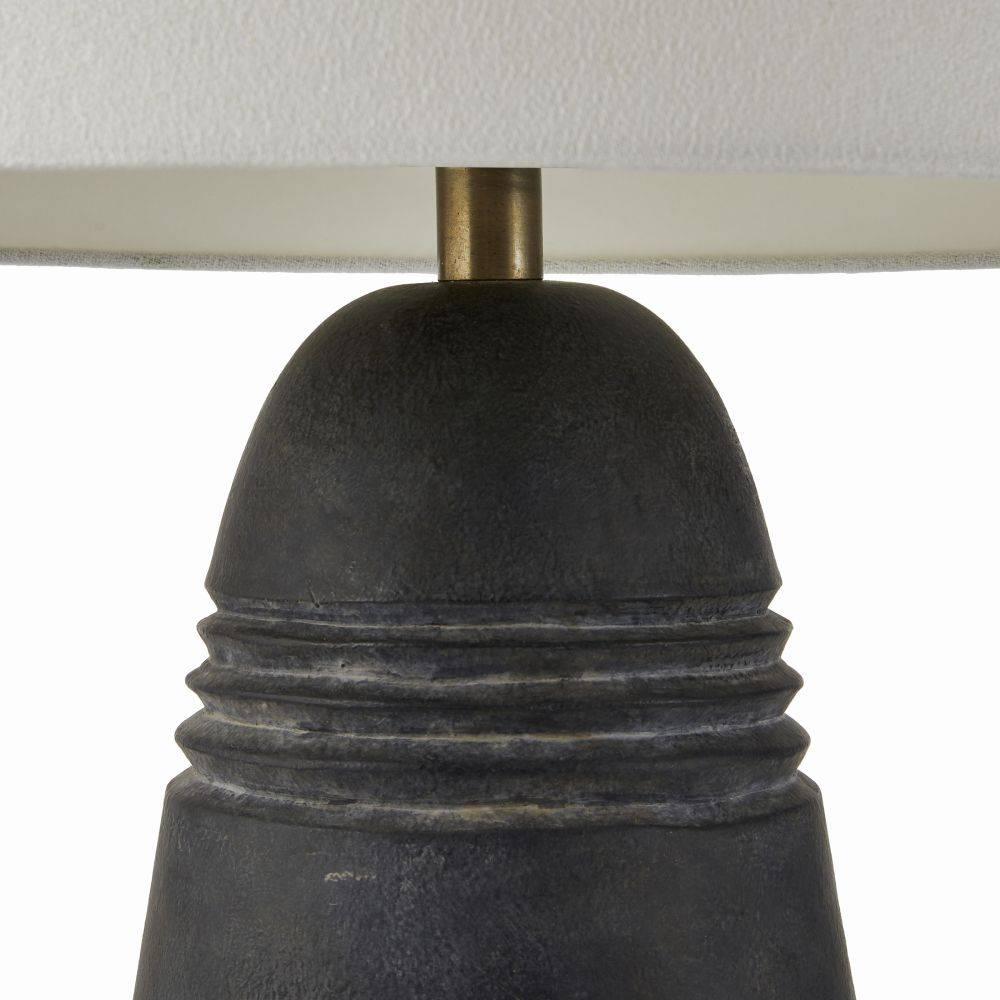 Made for an organic modern space, the Django’s monolithic form adds a bold contrast in a neutral room. A matte charcoal terracotta base is carefully gauged with groove-like details at its top and base. Crowned with an off-white linen drum shade, this minimalist accessory also features antique brass hardware and a matching finial. Finish will vary.