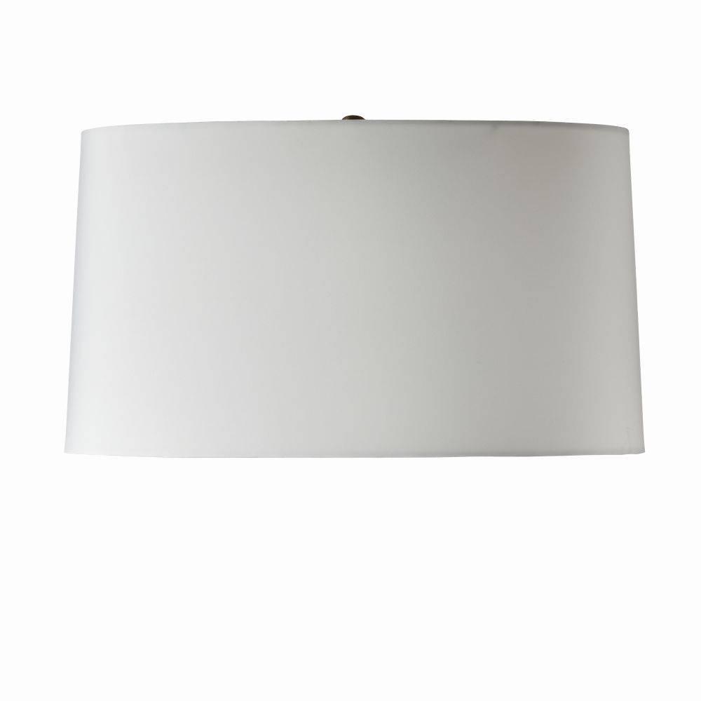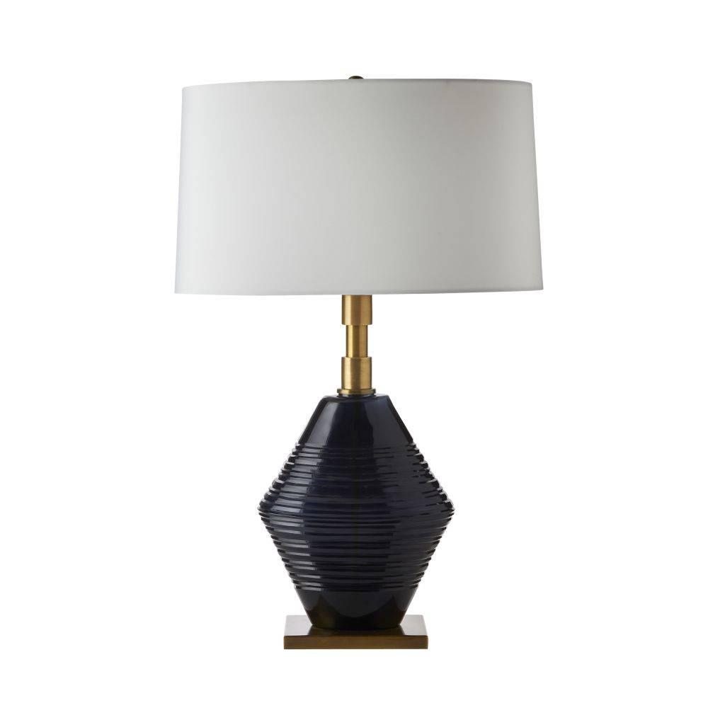 Hand-crafted of navy optic glass, the stacked base of the Estrada reflects the diamond-bodied shape of a halibut. Mounted on a square antique brass base with matching hardware, this rich style is crowned with a turned metal neck topped with an oval off-white microfiber shade.