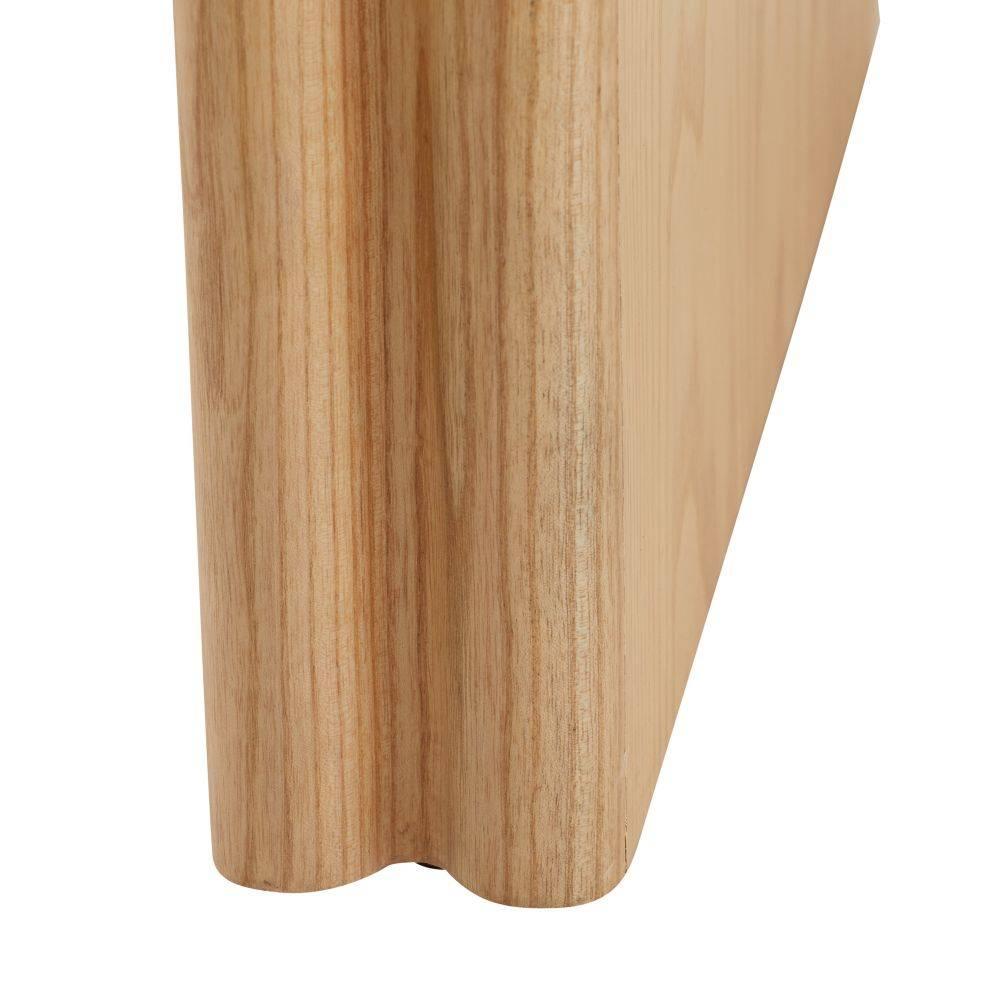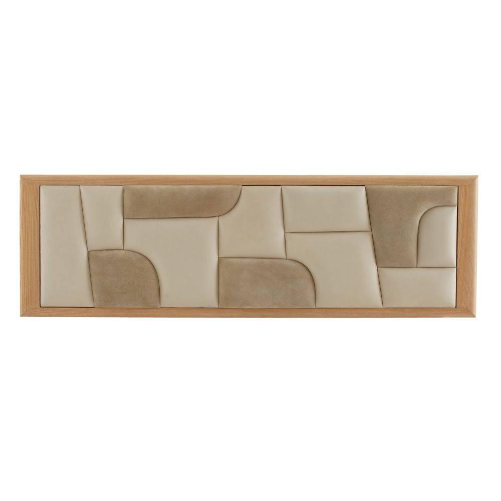 Tone-on-tone greige leather and taupe suede add textural allure to a waterfall blonde ash wood frame. Built at a more extended scale for larger living areas, the base's bullnose edges complement the geometric patterns of its eye-catching seat. Each puzzle-like piece is upholstered separately. Leather and suede will vary.