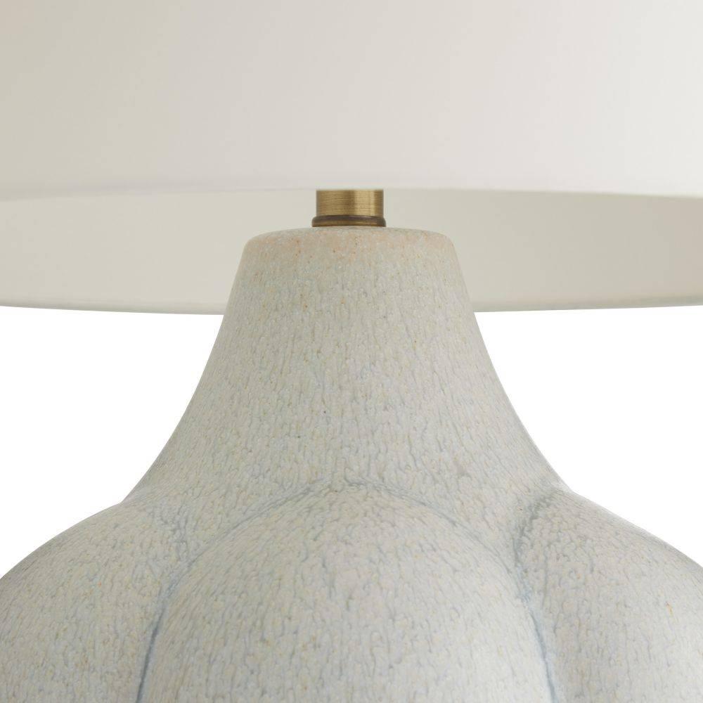 Like a ripe piece of fruit, the grooved silhouette of this ceramic table lamp brings a feeling of growth and abundance to any corner. Finished in an icy morn glaze with antique brass-plated steel hardware, it is topped with an ivory microfiber drum shade lined in off-white cotton secured with a matching finial. Finish will vary.