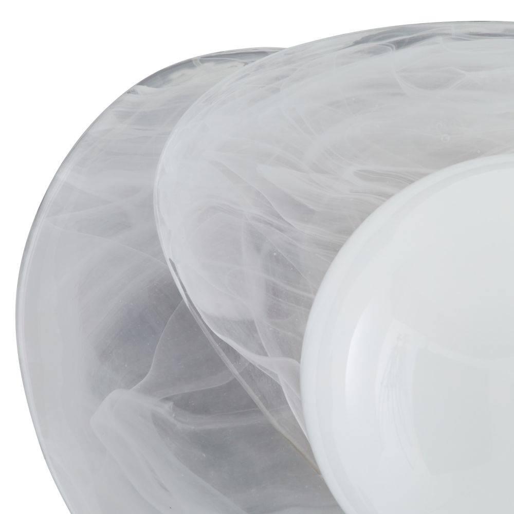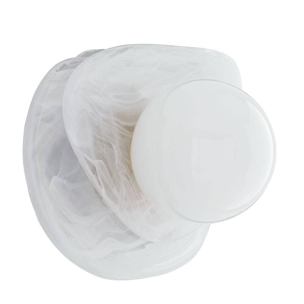 Mimicking a pearl inside an oyster's shell, an opal glass orb is mounted to a handblown swirl glass fixture and secured to a brass-plated iron backplate, this jewel-like light can be hung in any direction. Damp-rated, although limited covered outdoor areas may affect finish.