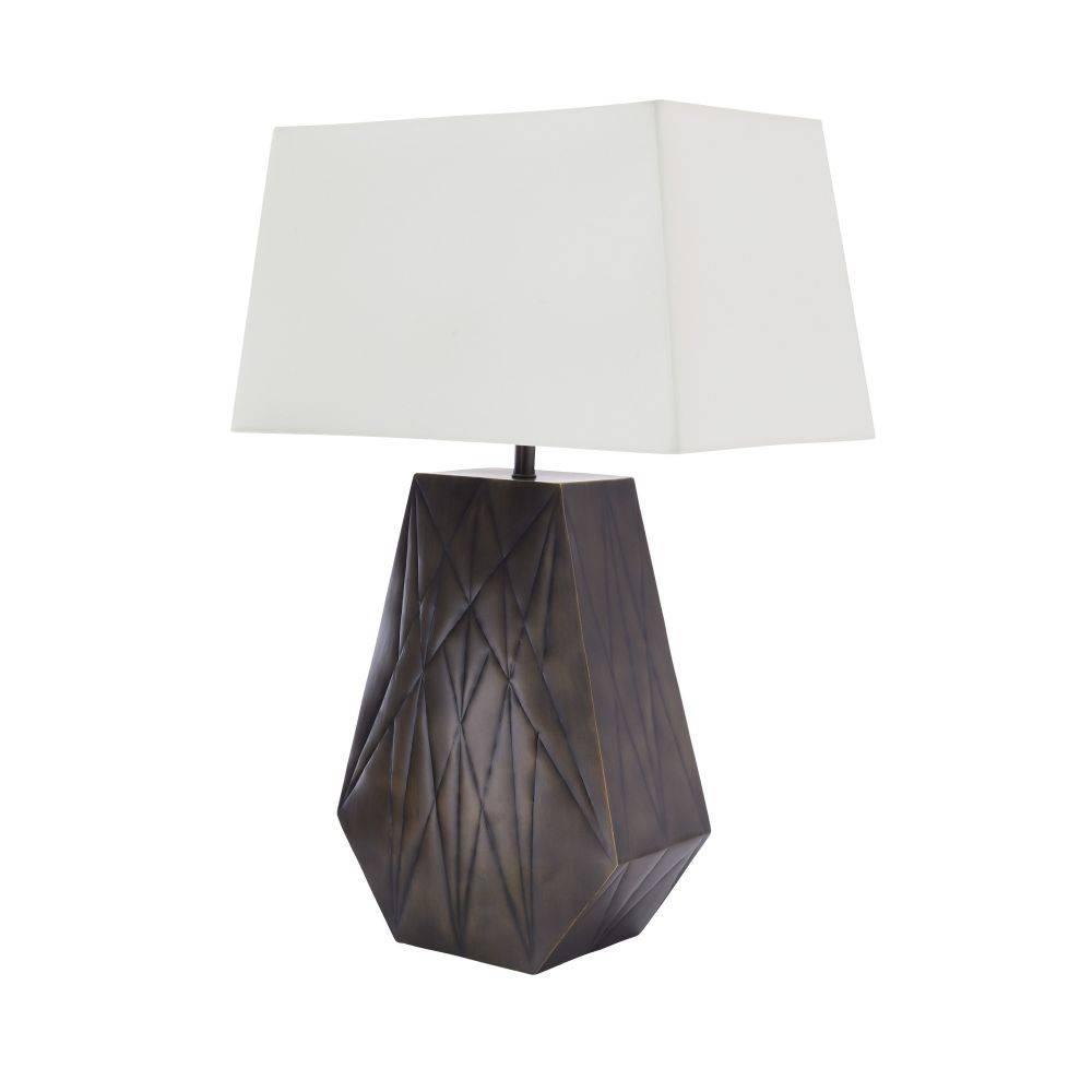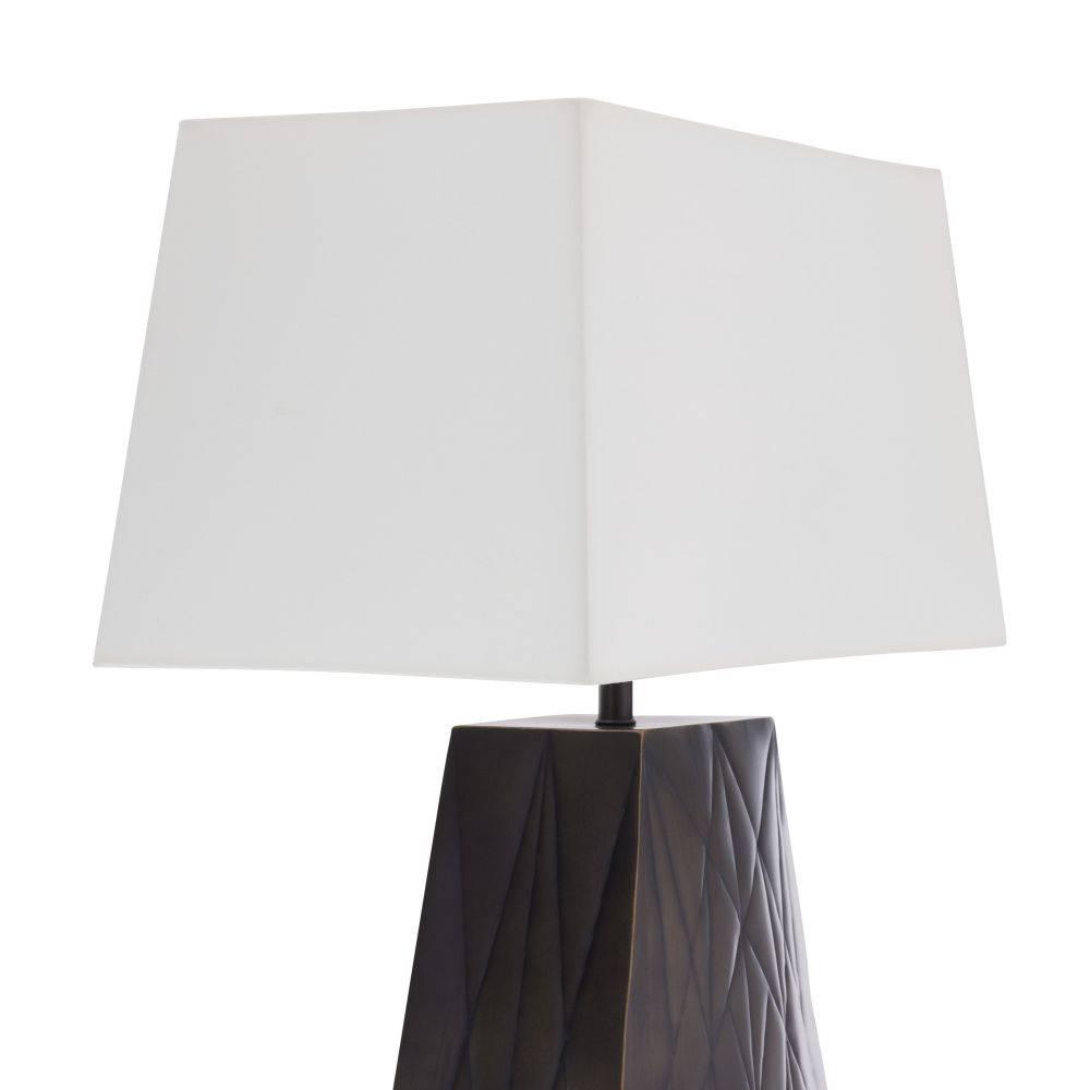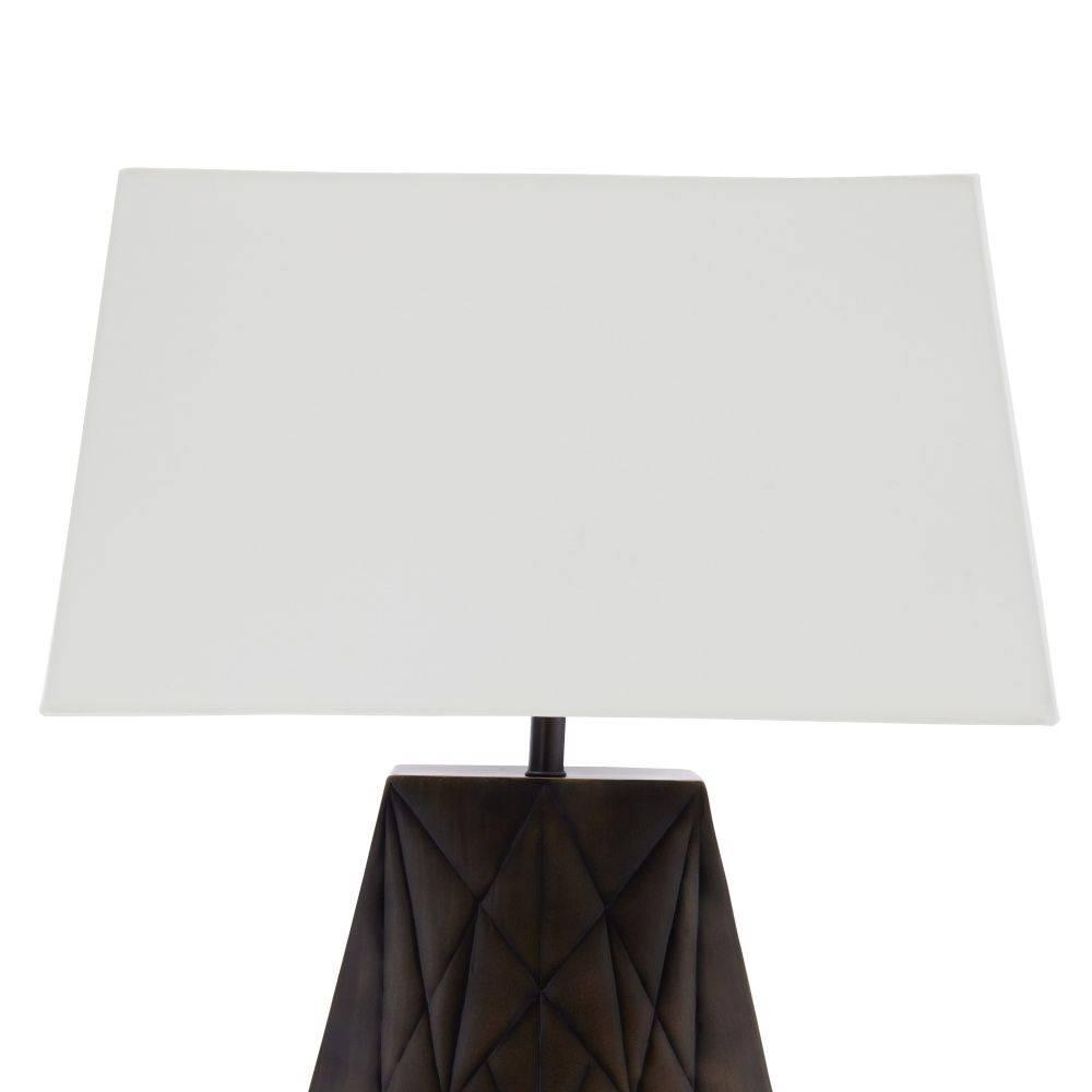 Inspired by a New York City skyscraper, this table lamp's grooved texture was designed to appeal from every angle. Crafted of bronze-plated iron, it floats within the room, illuminating with a billowed effect. A rectangular off-white cotton shade and matching finial add to the lamp's graphic appeal. Finish will vary.