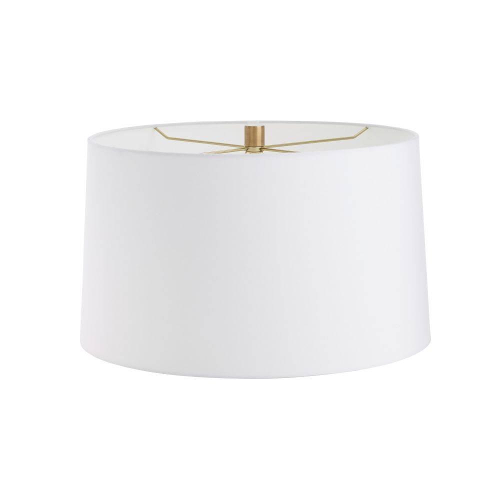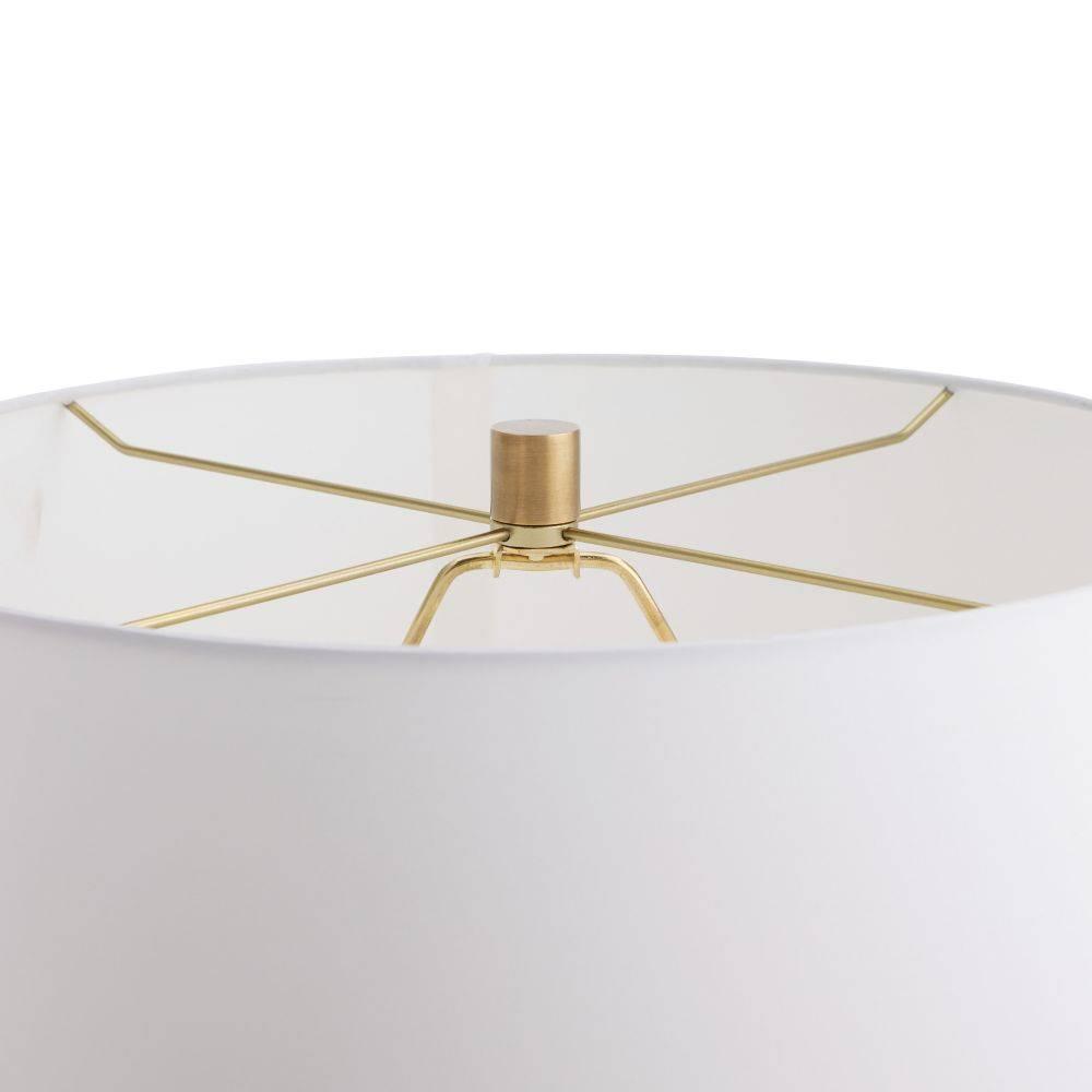 Clear etched glass and vintage brass form an alluring combination on our tailored table lamp. A brass-plated iron base is surrounded by intersecting etched cylinders that play with layering and transparency. An off-white microfiber drum shade lined in off-white cotton is secured with a matching finial.