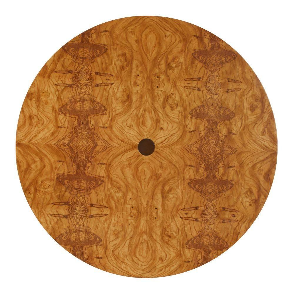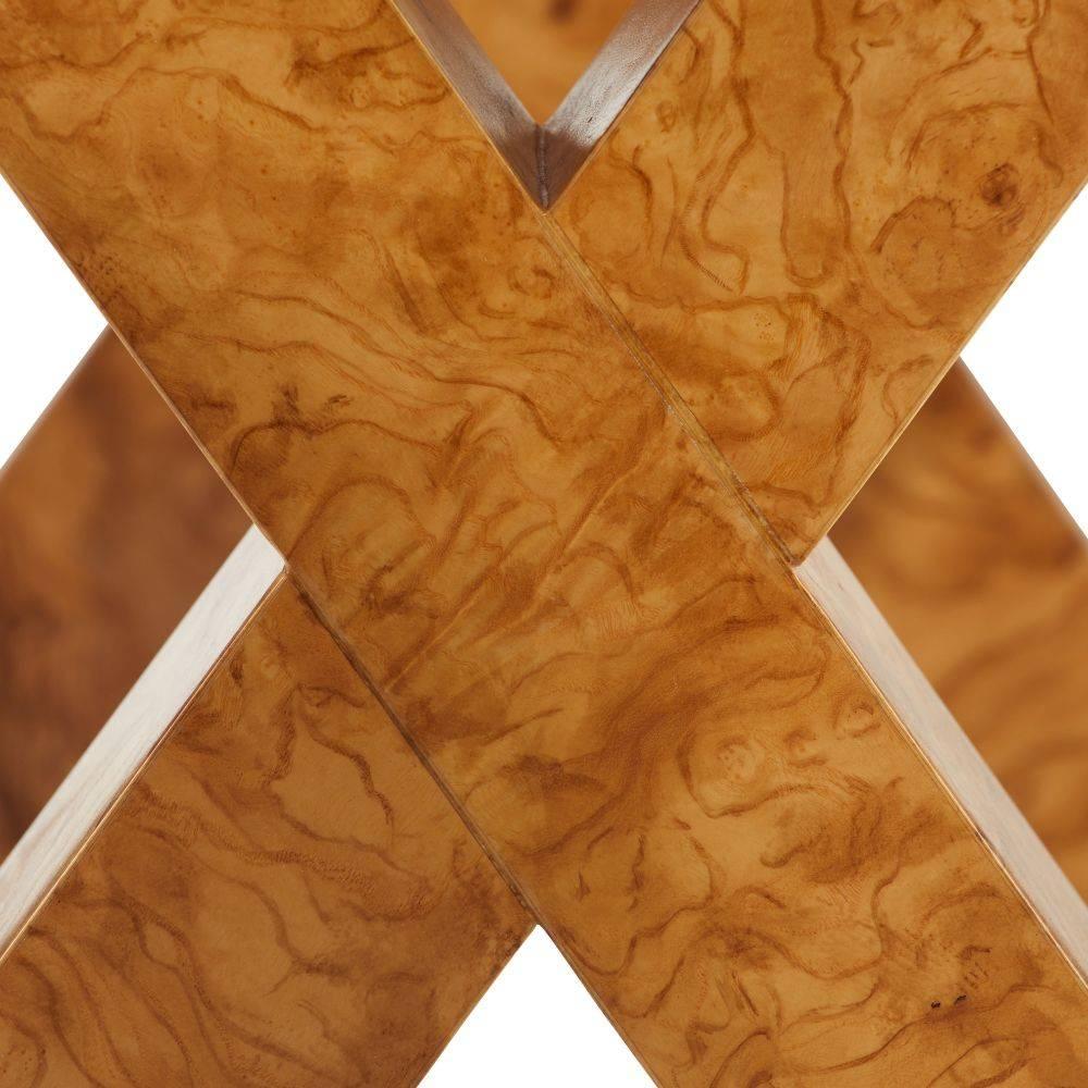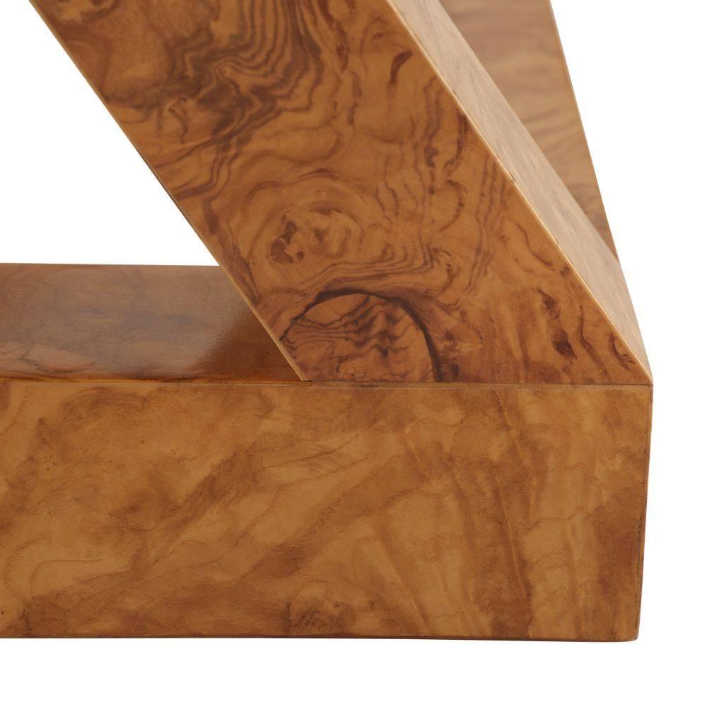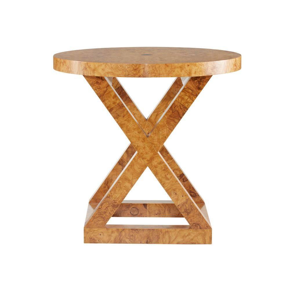 Overscaled for spacious living, this stylish end table updates the classic English Campaign style for today. Crafted of traditional blonde burl olive ash veneer, its exaggerated proportions make it a smart choice for a corner vignette. A bronze-plated brass inlay punctuates the top. Finish will vary.
