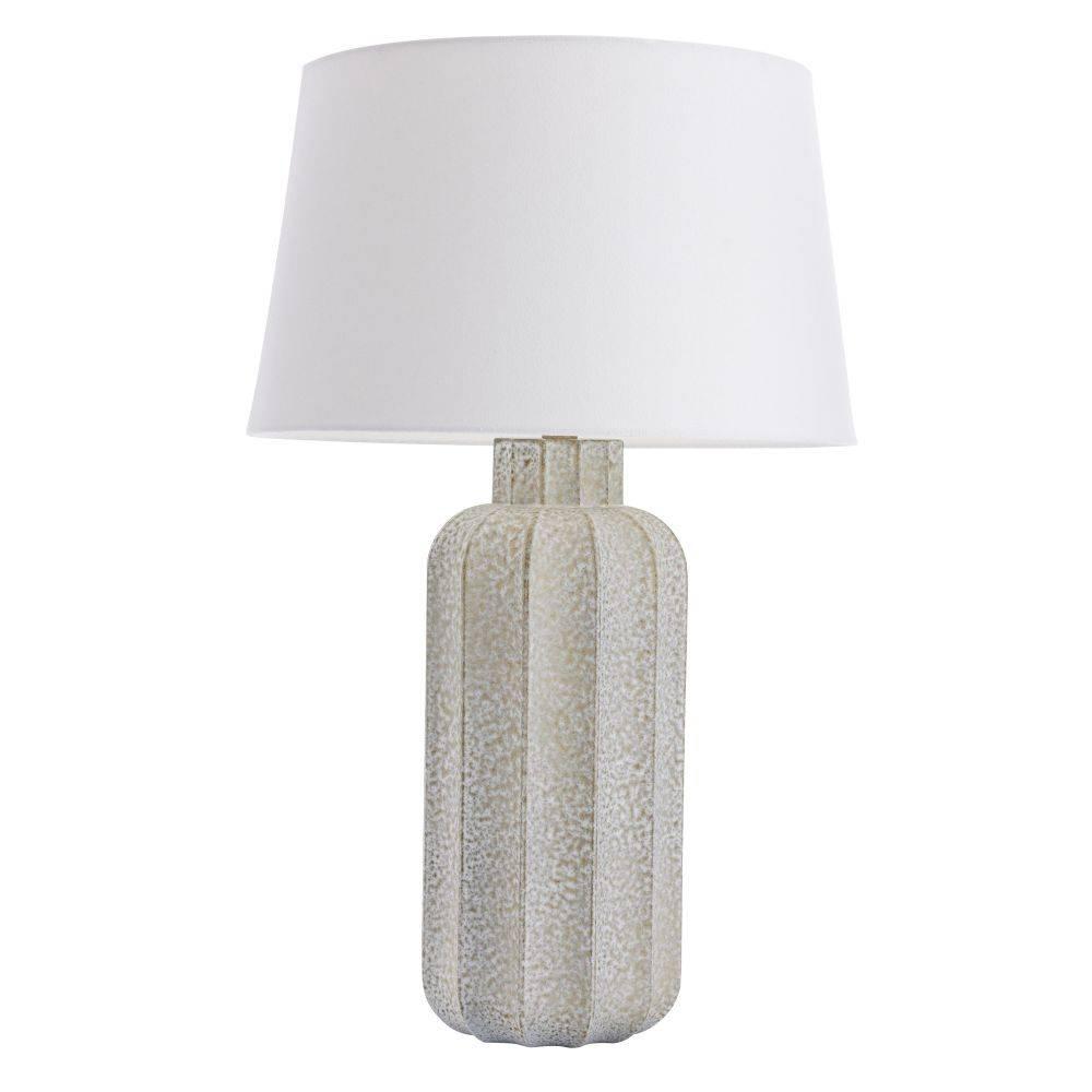 A traditional architectural form reinvented on a larger scale in textural porcelain. Glazed in a lunar reactive finish, its surface recalls a freeform coral reef. Accented with antique brass-plated steel hardware and sphere-shaped finial. Off-white linen drum shade lined in off-white cotton. Finish will vary.