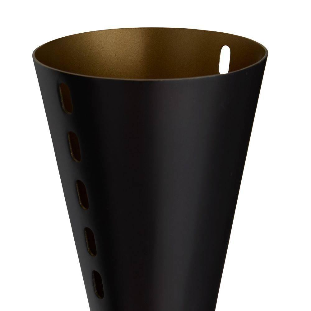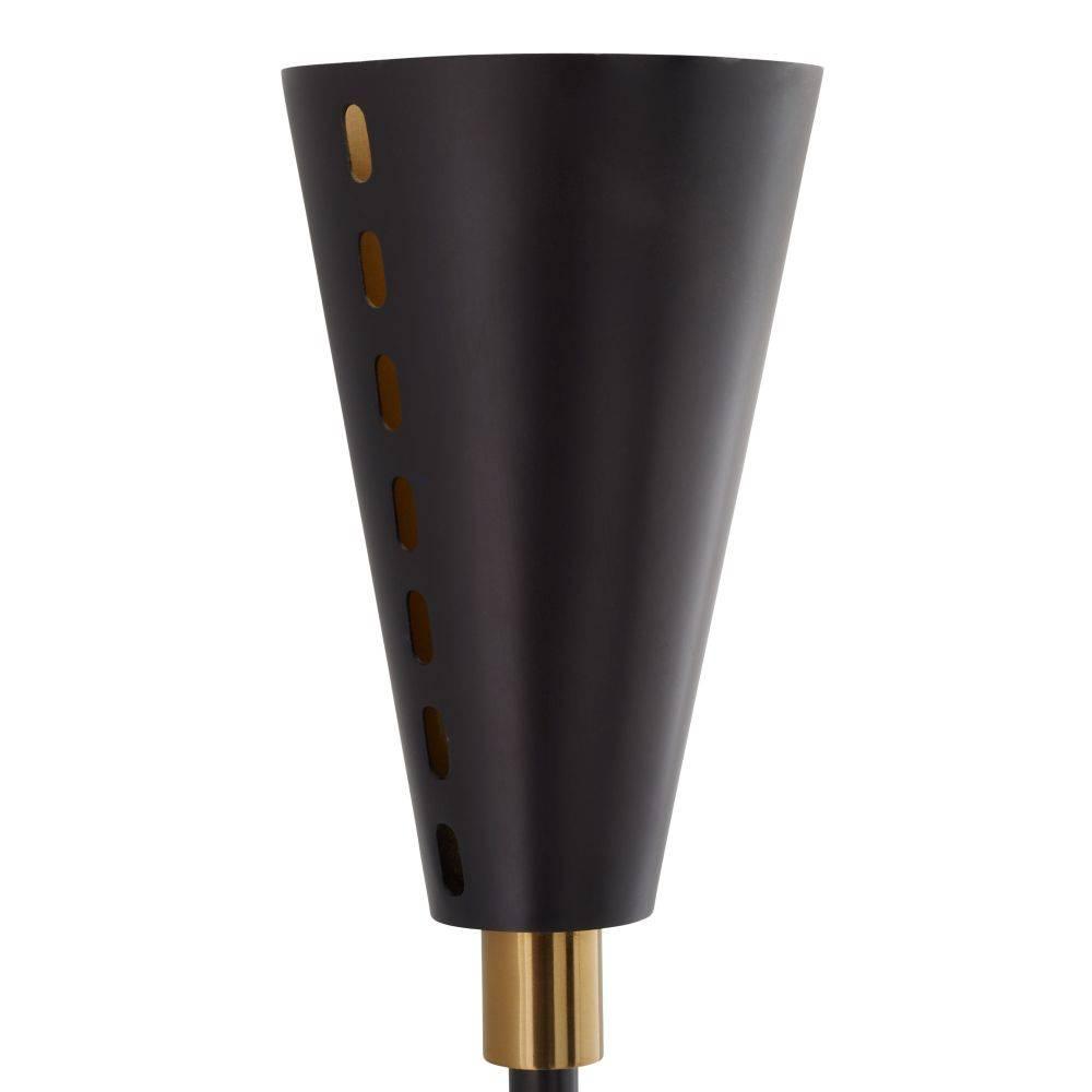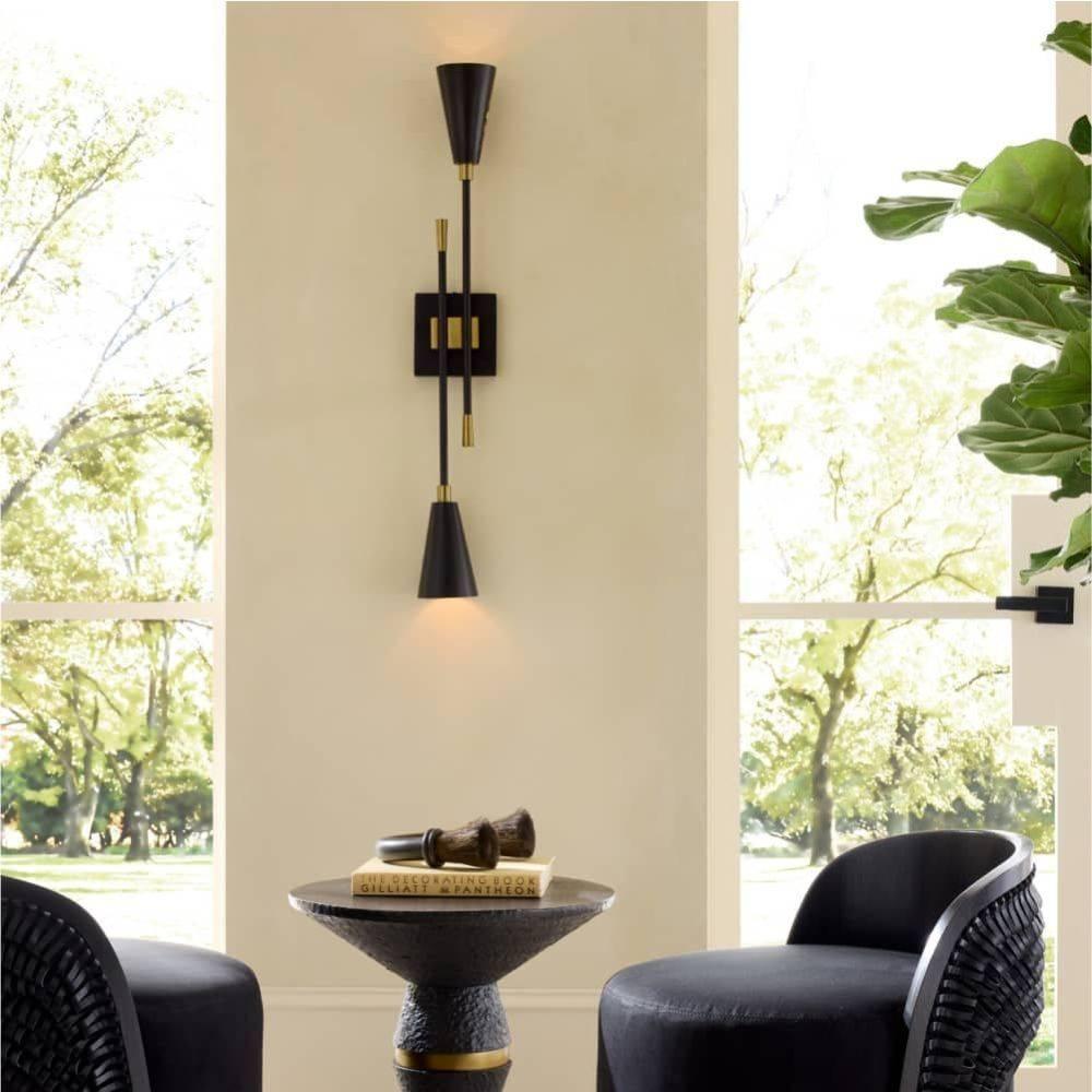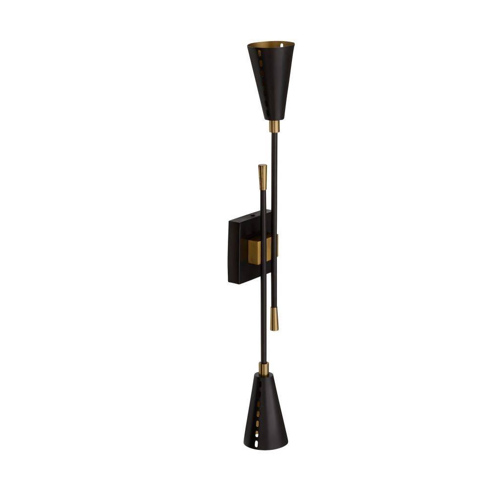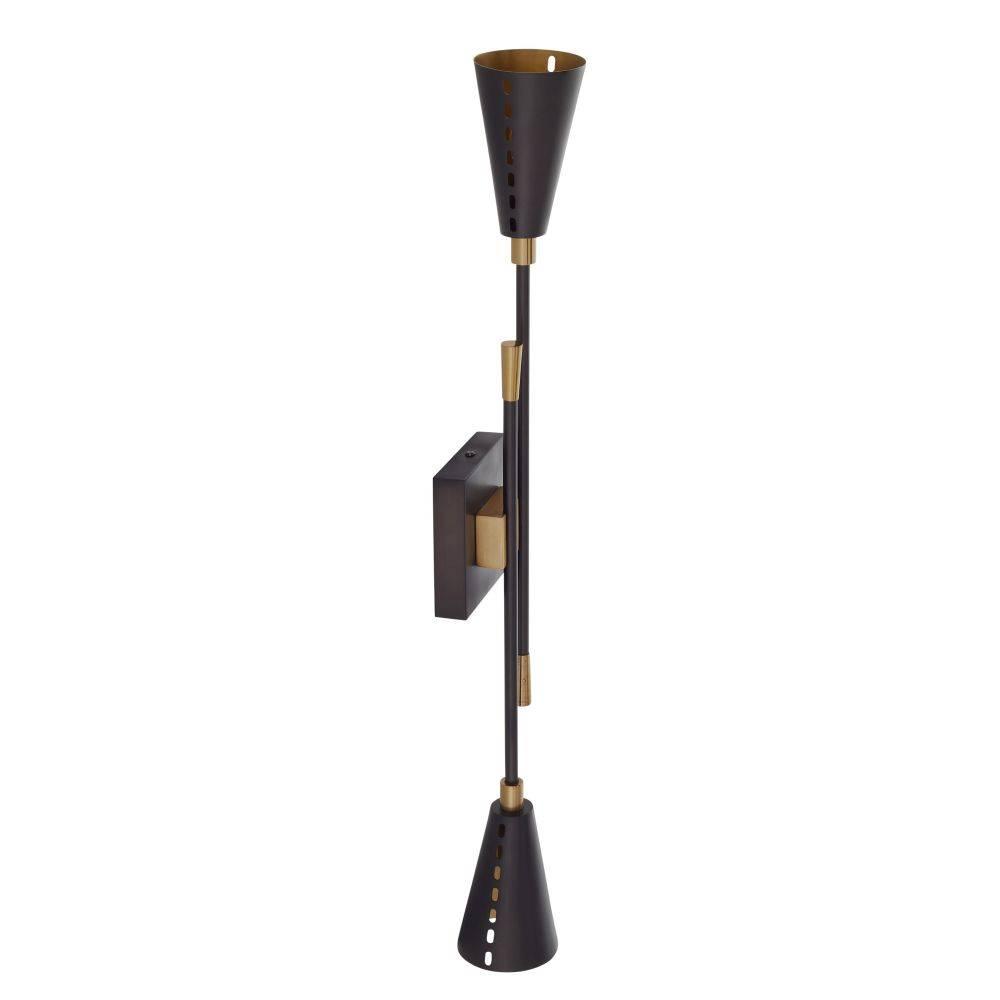 Dual trumpet shades aim light both upwards and downwards in a stylishly tailored bronze-plated iron sconce. Antique brass-plated iron details glimmer at the connection points between the pipe and backplate and inside each sleek shade. Perforated for an intriguing light bleed, the Herrera can be hung vertically and horizontally. Damp-rated, although limited covered outdoor areas may affect finish.