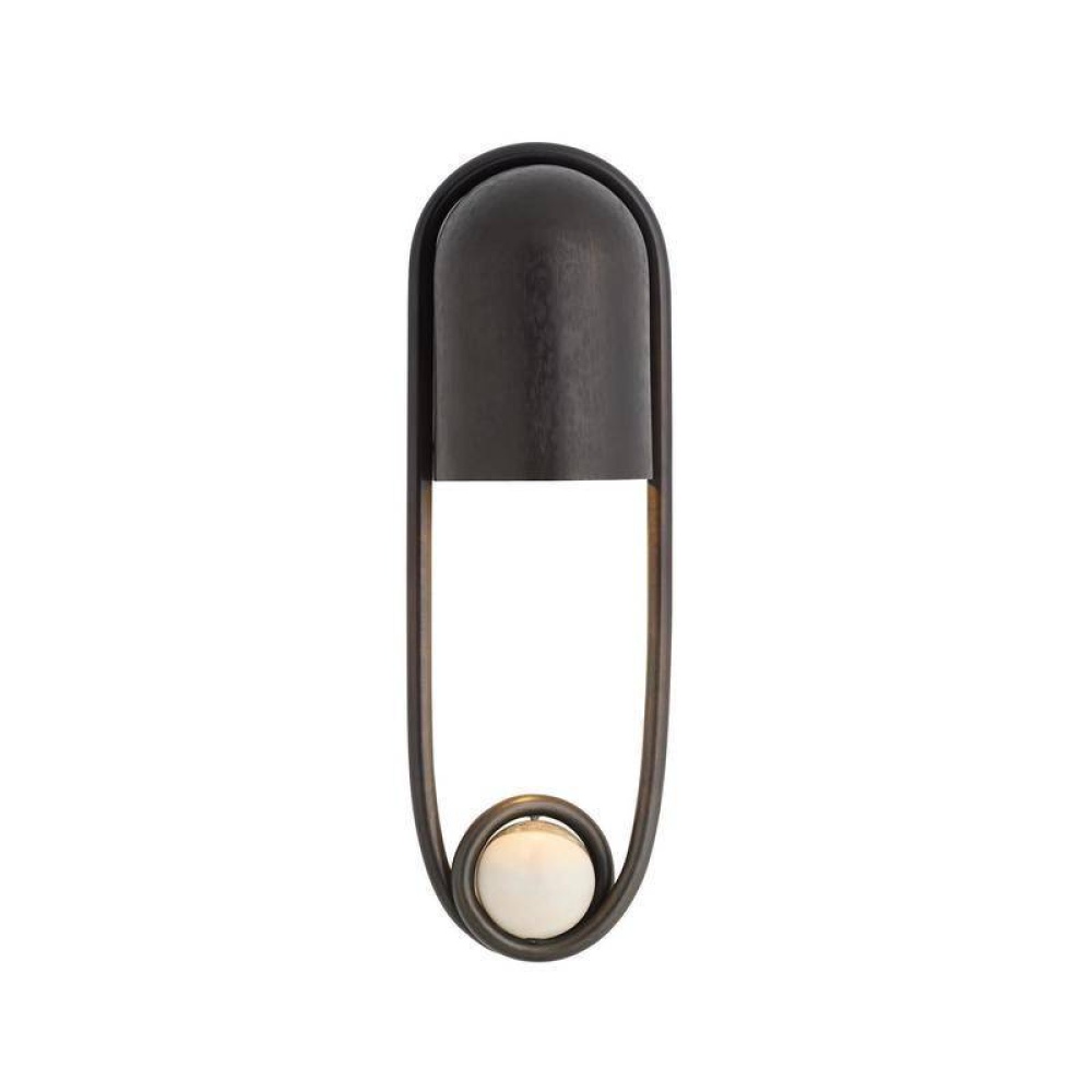 A stirrup-shaped sconce captures a white and gray marble sphere in a loop of English bronze-plated steel. The hooded chattered English bronze-plated steel silhouette was devised to deliver a moody wash of light across the wall and can be staged in multiples for brighter illumination. Finish will vary. Damp-rated, although limited, covered outdoor conditions may affect finish.