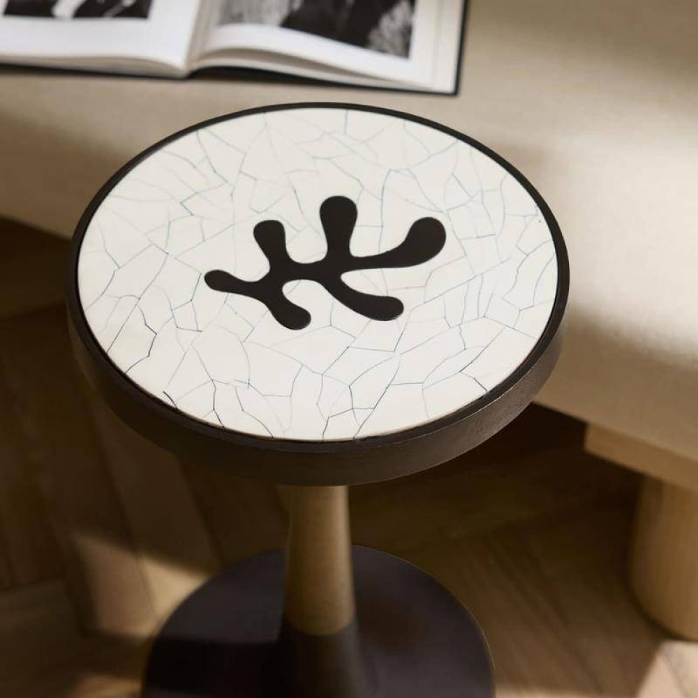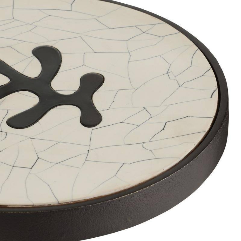 Inspired by Matisse's fluid shapes, a free-form floral motif lends an artistic edge to the beige crackled resin surface of our table. The bronze iron fluted base is enhanced with antique brass iron, adding a two-tone accent to intrigue the eye. Finish will vary.