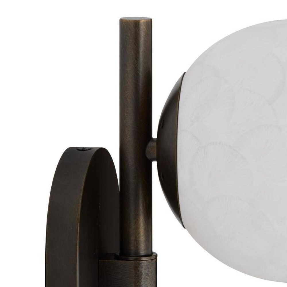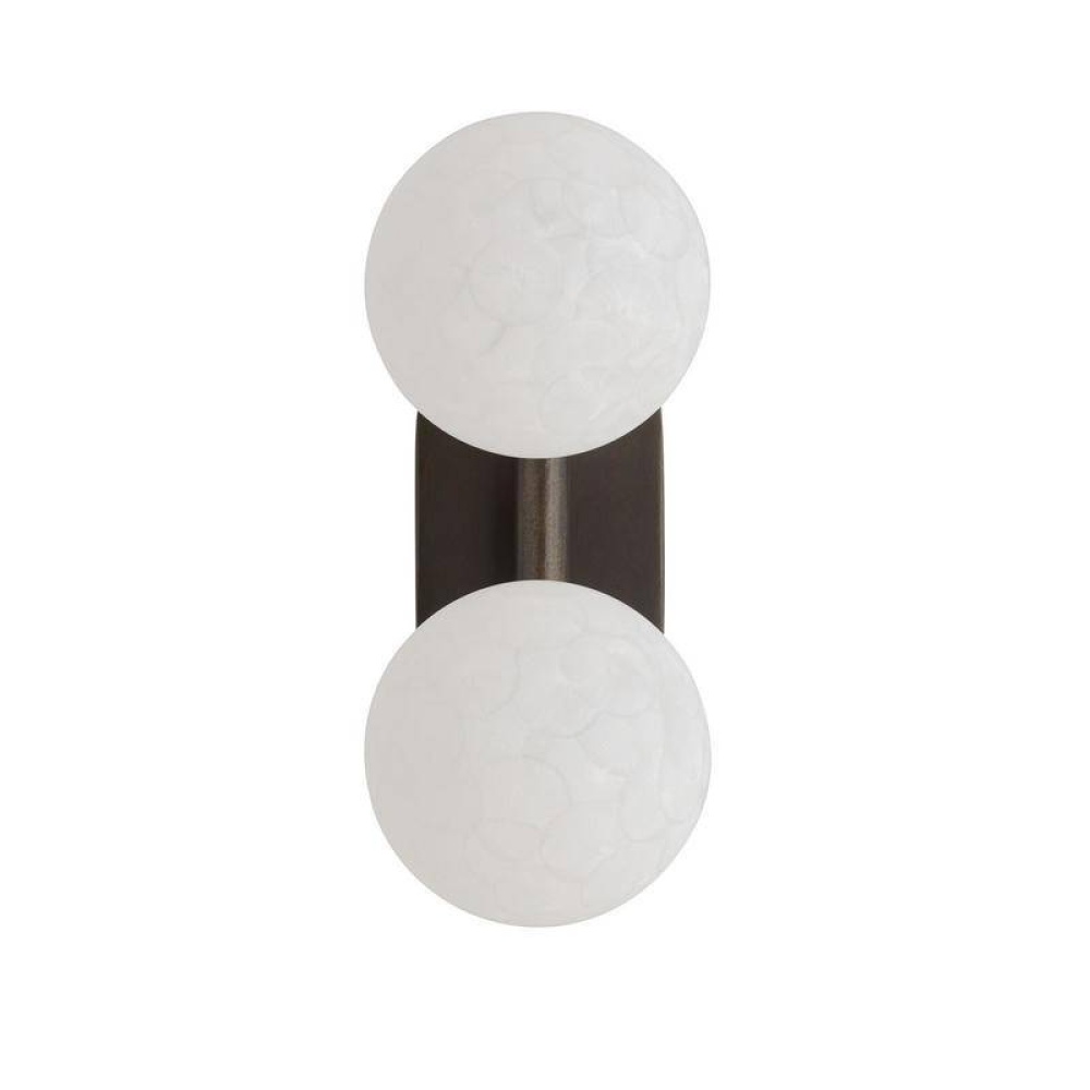 Like the moon orbiting around a planet, double globes of matte white textured glass offer a lunar allure. Finished with a stony coral texture, this clever celestial-inspired fixture's globes can be rotated left or right to deliver light where it is needed most. Mounted on a backplate of English bronze-plated steel. Finish will vary. Damp-rated, although limited, covered outdoor conditions may affect finish.