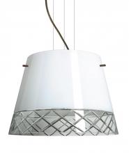 Amelia features a tapered drum shape that fits beautifully in transitional or eclectic themed spaces. Includes flat frosted glass bottom diffuser. Black Damask is an art deco creation in handcrafted glass. The inside of the glass is etched so the pattern appears frosted then the background is painted in black on the inside, with white inside that. This allows the outside surface to stay glossy. This pendant luminaire makes a statement with a handcrafted glass shade and stainless steel cable support. Satin Nickel metal finish.
