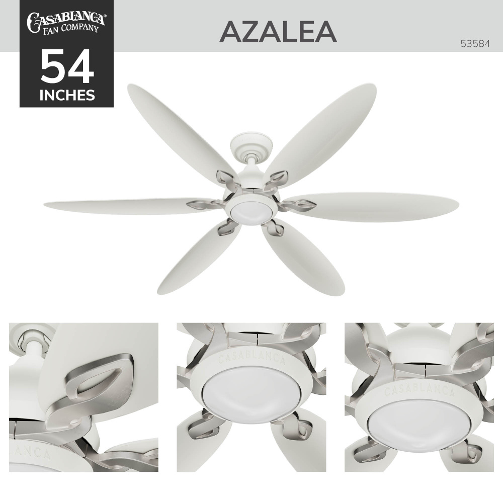Admire Casablanca’s Azalea ceiling fan, where elegant design meets energy efficiency. ENERGY STAR® certified, it's up to 64% more energy-efficient. The Azalea features blade designs that resemble delicate flower petals, adding a touch of natural beauty to any space. Built with the SureSpeed® Guarantee for faster airflow, this fan includes a 6-speed Eco Whisper DC motor for efficient and quiet operation. Damp-rated for covered outdoor spaces, it also boasts an LED module and metal accents, making it a perfect blend of style and functionality.