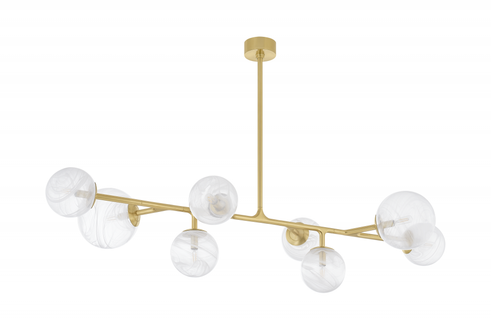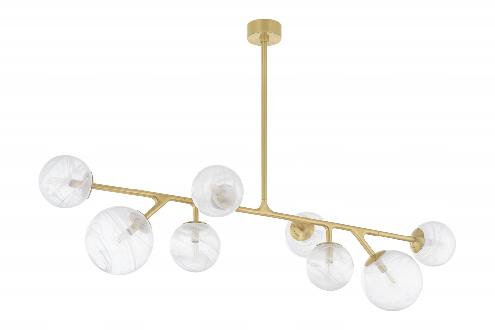 The Glasgow family of chandeliers and linears captures the old-meets-new vibrancy of its namesake Scottish city. Resembling celestial bodies in the night sky, the Remolino Blanco swirled glass globes are suspended from a branch-inspired Vintage Polished Brass frame. Choose from different formats to suit your space, from 8 to 24 lights.