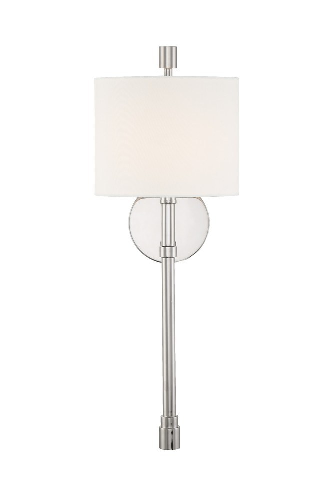 The simple and tailored form gives the Rachel wall mount a refined elegance. The oval white silk shade produces just the right amount of soft light to make a comfortable and inviting space. To maximize this design's versatility, each Rachel wall mount ships with both a metal tail + finial and glass tail + finial.