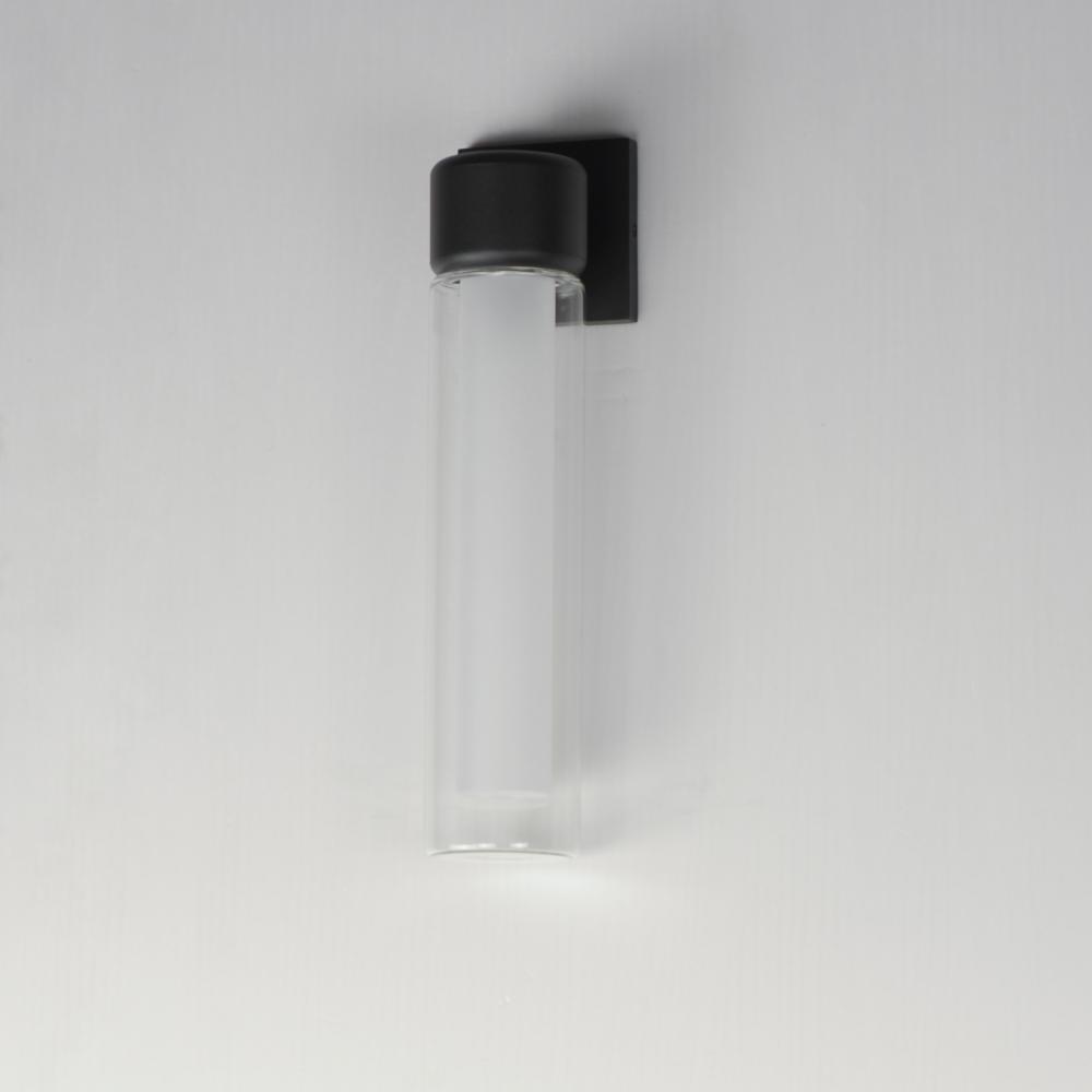 Dual Cylinder glass shades diffuse LED light bulbs concealed within rounded caps in Black powder coat. The single sconce is wet located with intention to be used outdoors, while the complementary 3-Light wall sconce is perfect for use in transitional to mo