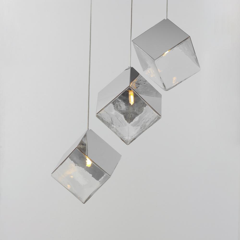 Like melting ice, these oversized cube pendants support cast glass shades from highly polished stainless-steel frames. Select from two finish combinations: a Clear glass shade paired with a Polished Chrome frame or soften the look with warm Amber glass pai