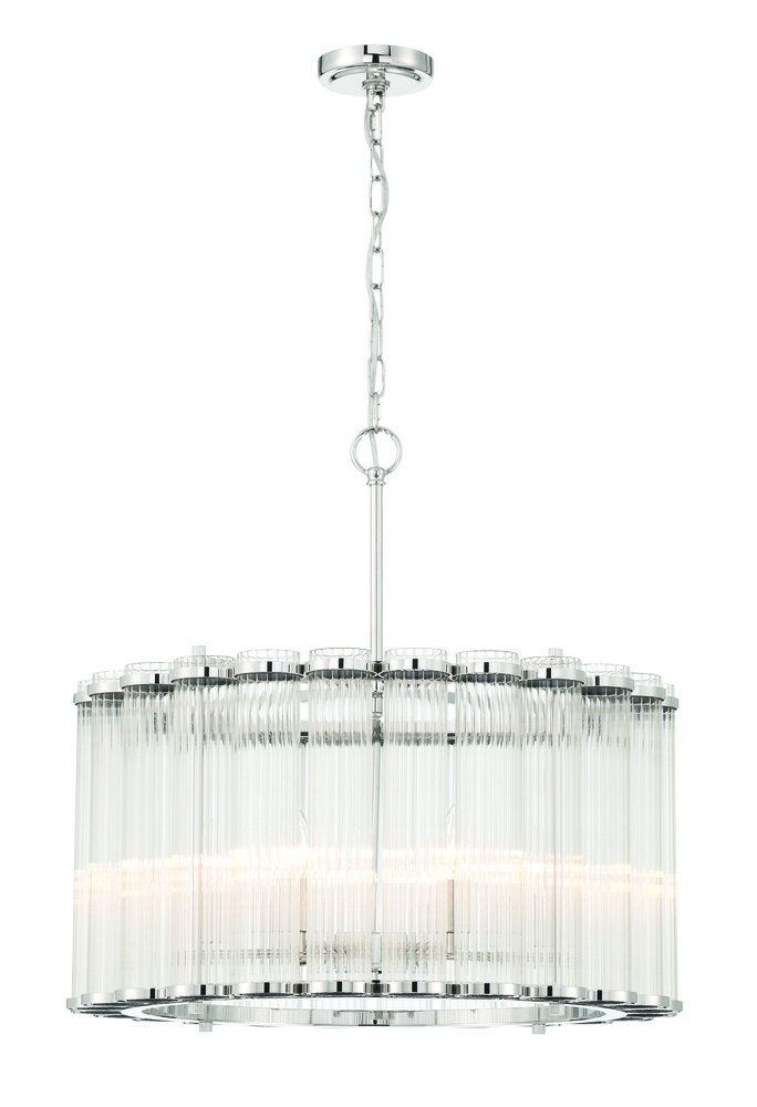 A regiment of ribbed cylinders, linked together at the top, encircle the central light sources to soften and diffuse, unveiling a stately, transitional allure that lends charm to living, entry and dining spaces.