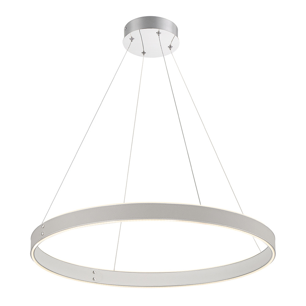 The Verdura collection features vegan leather, accentuated by decorative silver studs. The two-toned fabric highlights one color on the inside while displaying a complementary second color on the outer ring. The textured grooves are highlighted by the luminous glow of integrated LED lights that are encased between. This collection is not only abundant in size but also in the number of fixtures offered. Be it a small home office or a grand staircase, the Verdura collection is available in a range of fixture sizes to fit any room space.