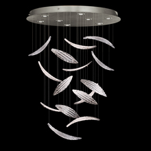 Elevate transcends your environment to new heights. Each glass spire is solid glass with contour carving and polishing and cased with a mixture of specialized crystalized silica to create a unique textural metallic surface. Illuminated from a gold leaf canopy and suspended by adjustable cables. This American handmade round fixture features 17 sculpted spires and is ideal for low ceilings.
