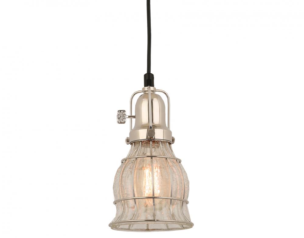 8 ft Black Cord Hung Pendant, Polished Nickel Finish, Clear Crackle Glass