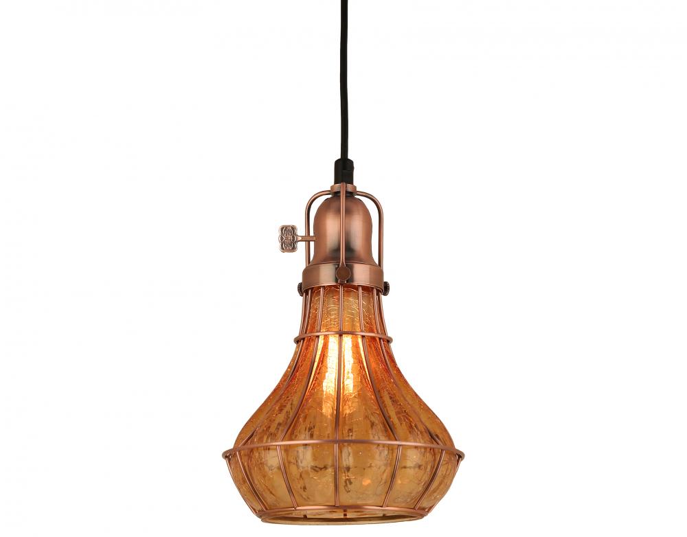 8 ft Black Cord Hung Pendant, Weathered Copper Finish, Amber Crackle Glass