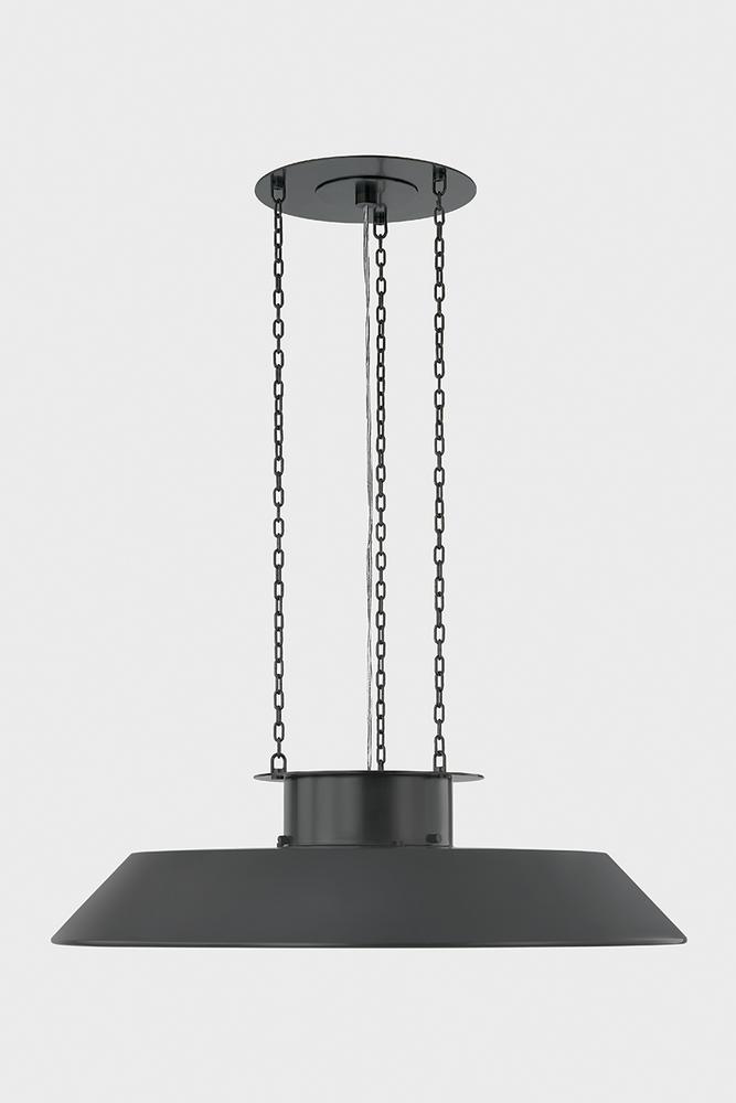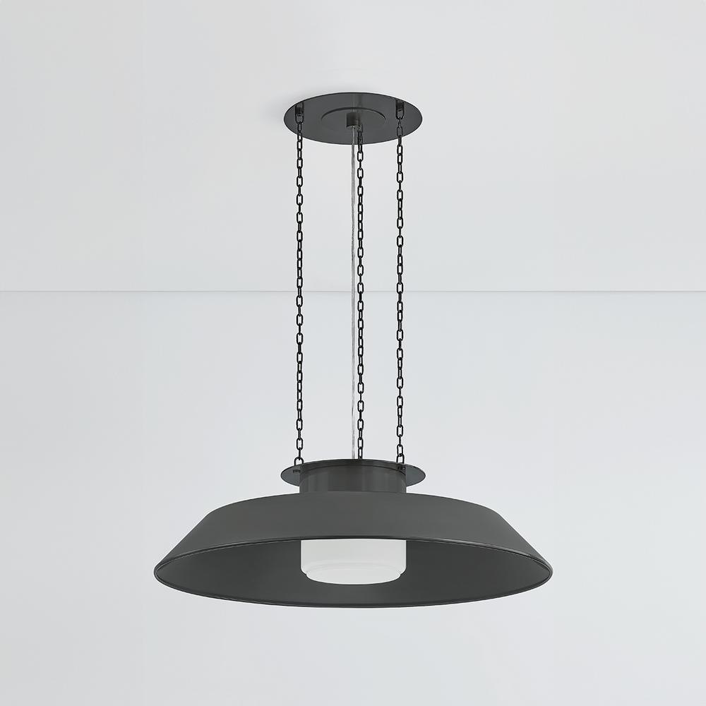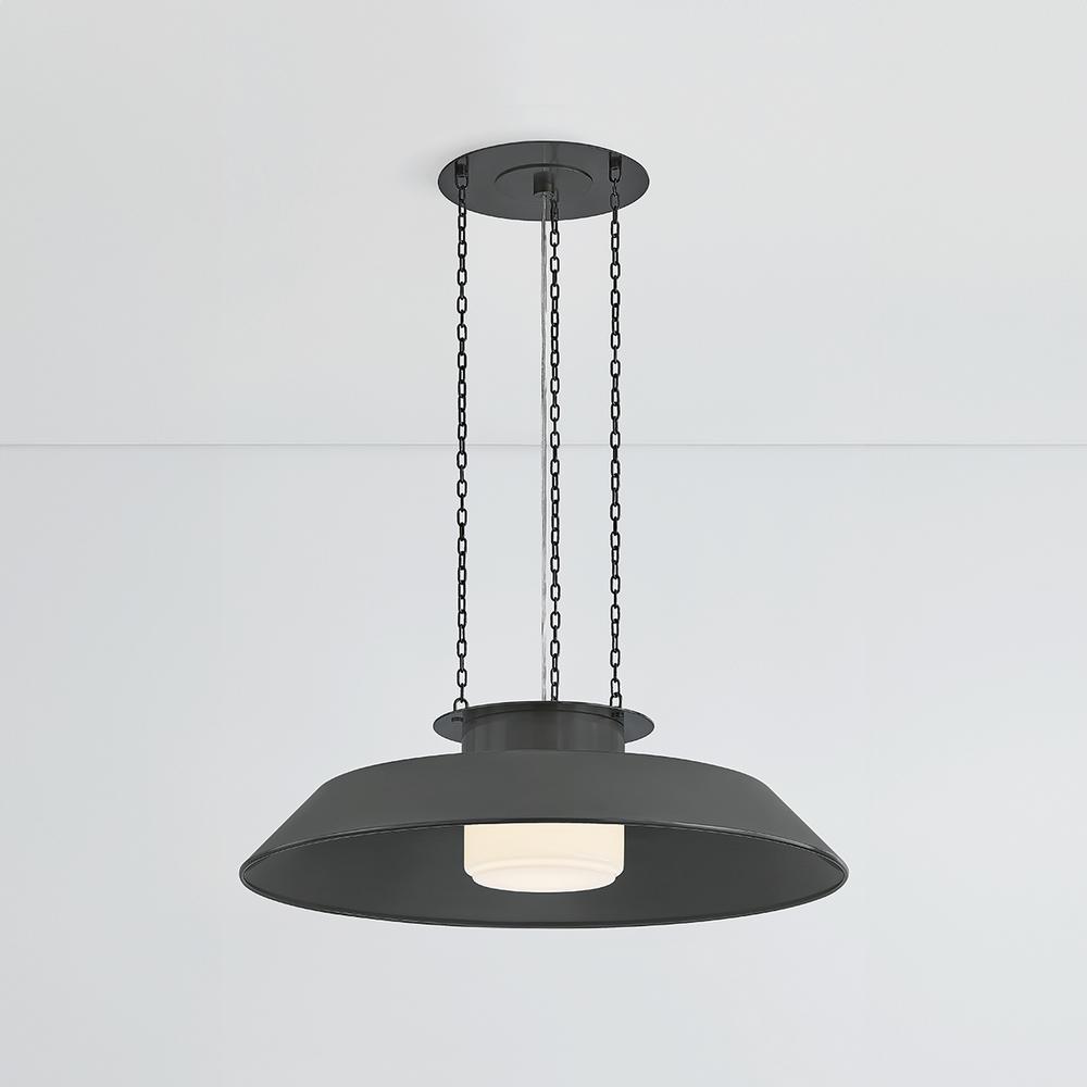 Taking cues from the innovative lamping techniques of bespoke maker brands, Woodrow features a classic RLM-style pendant silhouette. Beneath the large reflector, the opal shiny shade filters light both downwards and outwards. Three clean chains suspend this fixture, which is available in two sizes.