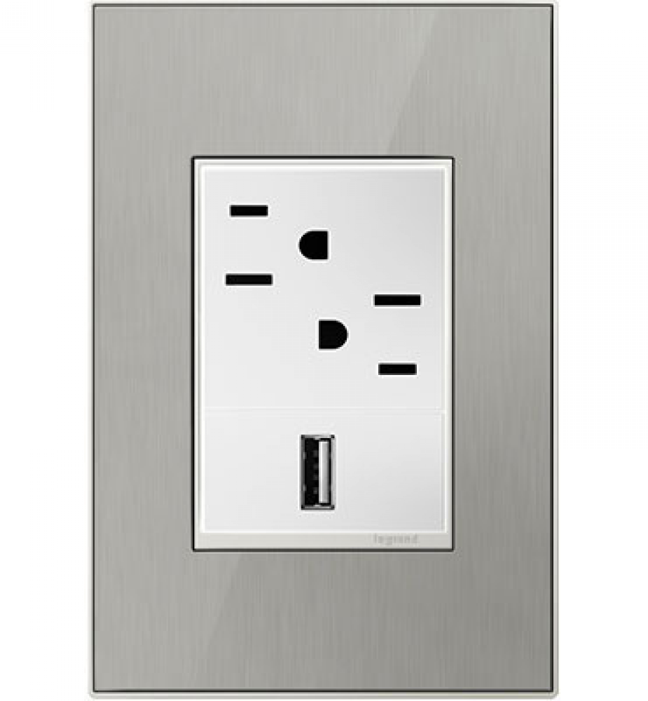 Stainless surface with satin nickel frame, for a trendy industrial touch that?s also sophisticated. A 1-Gang Wall Plate, it is perfectly sized to fit a standard-sized adorne device, or any combination of two half-sized adorne designer switches or outlets.
