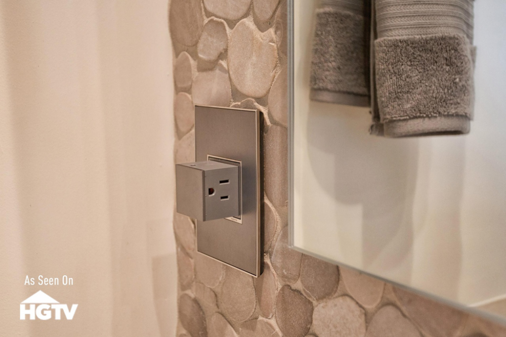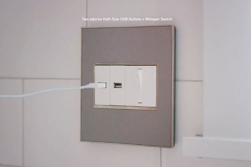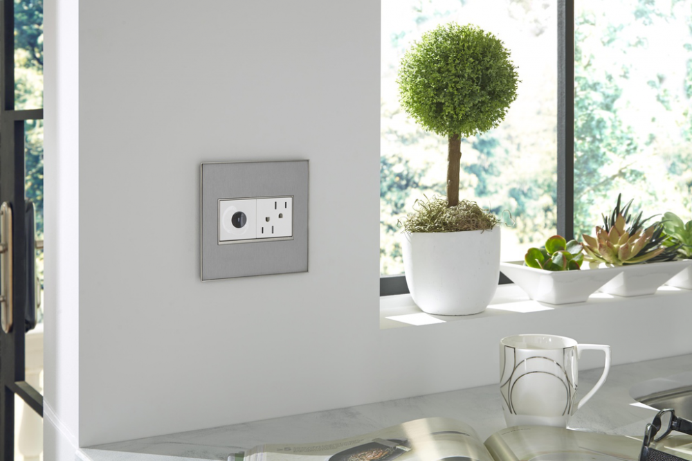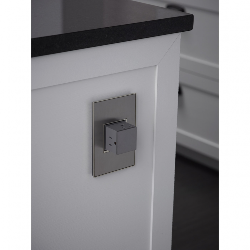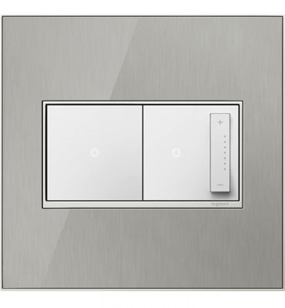 Stainless surface with satin nickel frame, for a trendy industrial touch that?s also sophisticated. A 1-Gang Wall Plate, it is perfectly sized to fit a standard-sized adorne device, or any combination of two half-sized adorne designer switches or outlets.