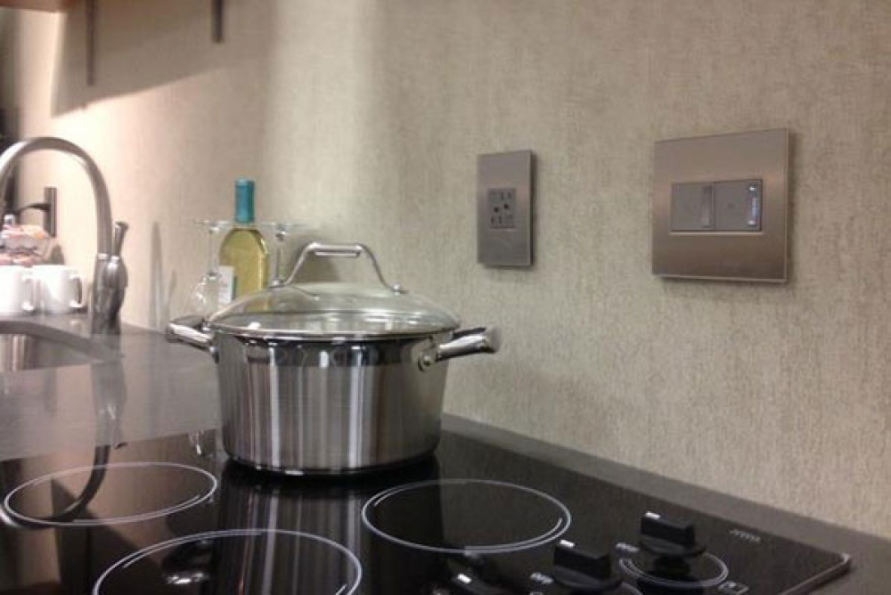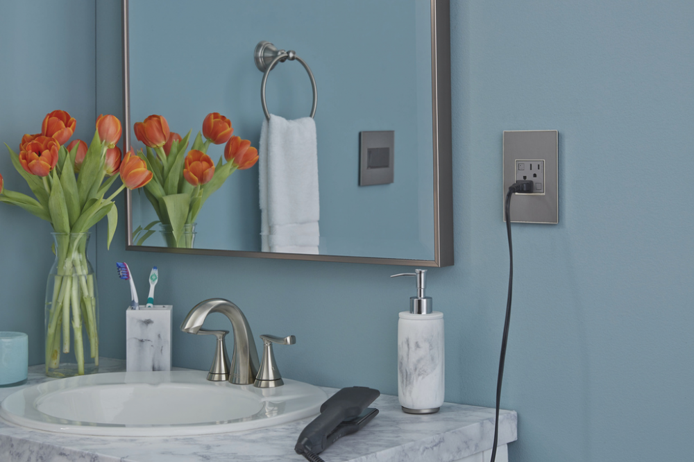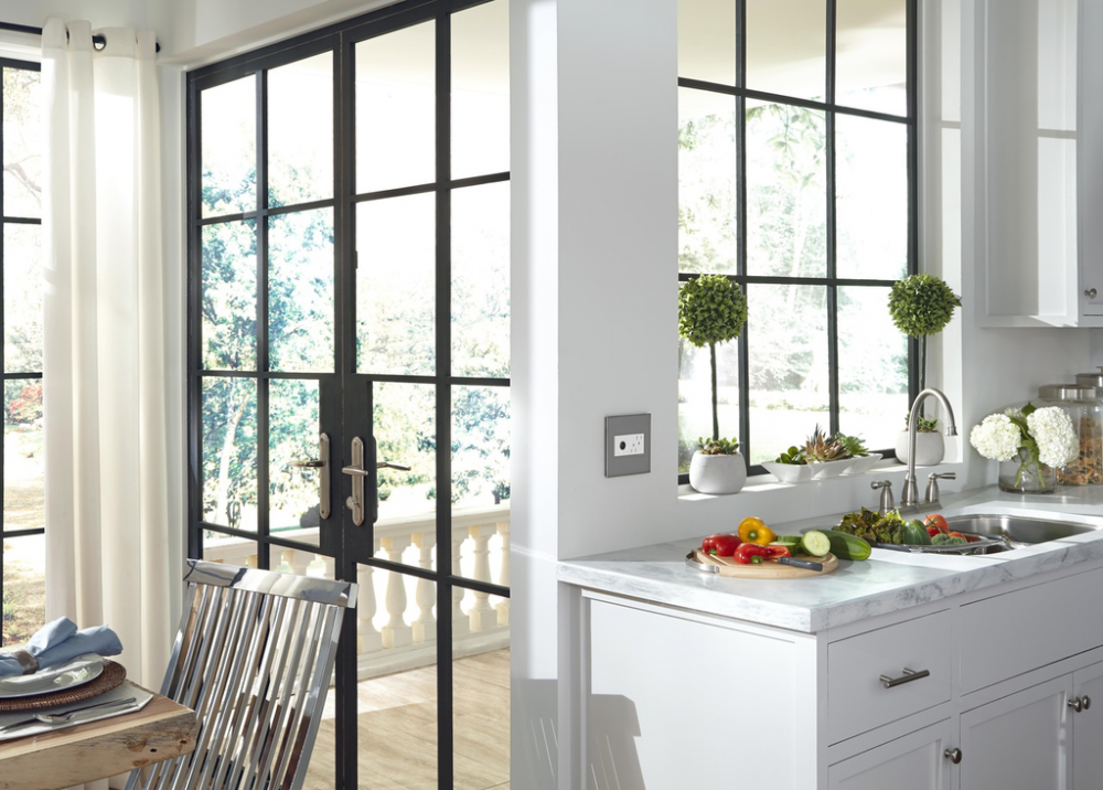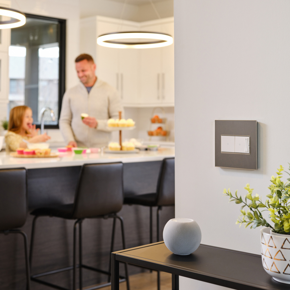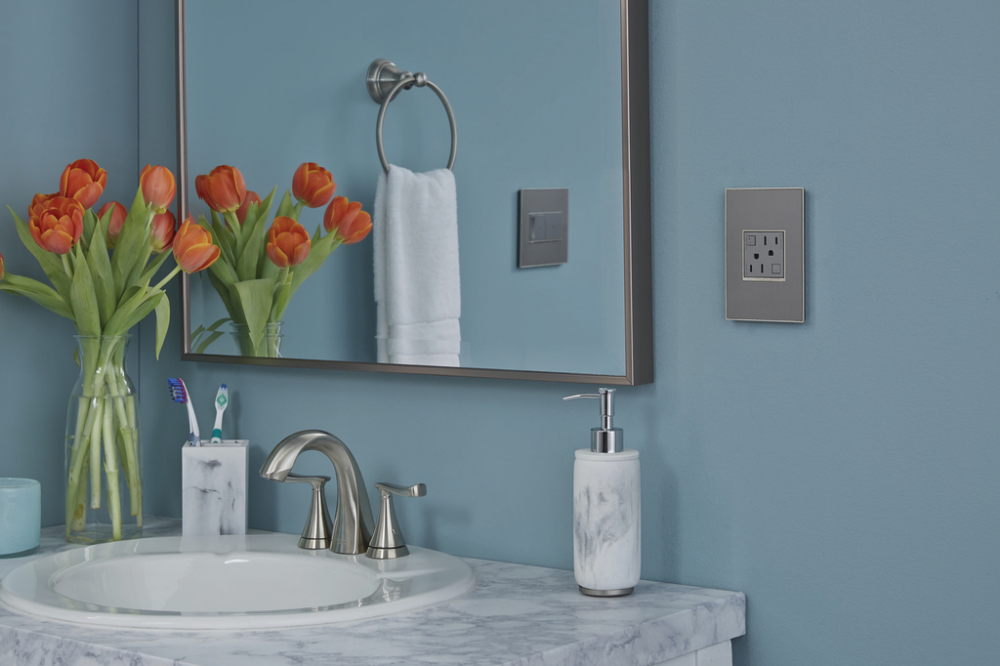Stainless surface with satin nickel frame, for a trendy industrial touch that?s also sophisticated. A 1-Gang Wall Plate, it is perfectly sized to fit a standard-sized adorne device, or any combination of two half-sized adorne designer switches or outlets.