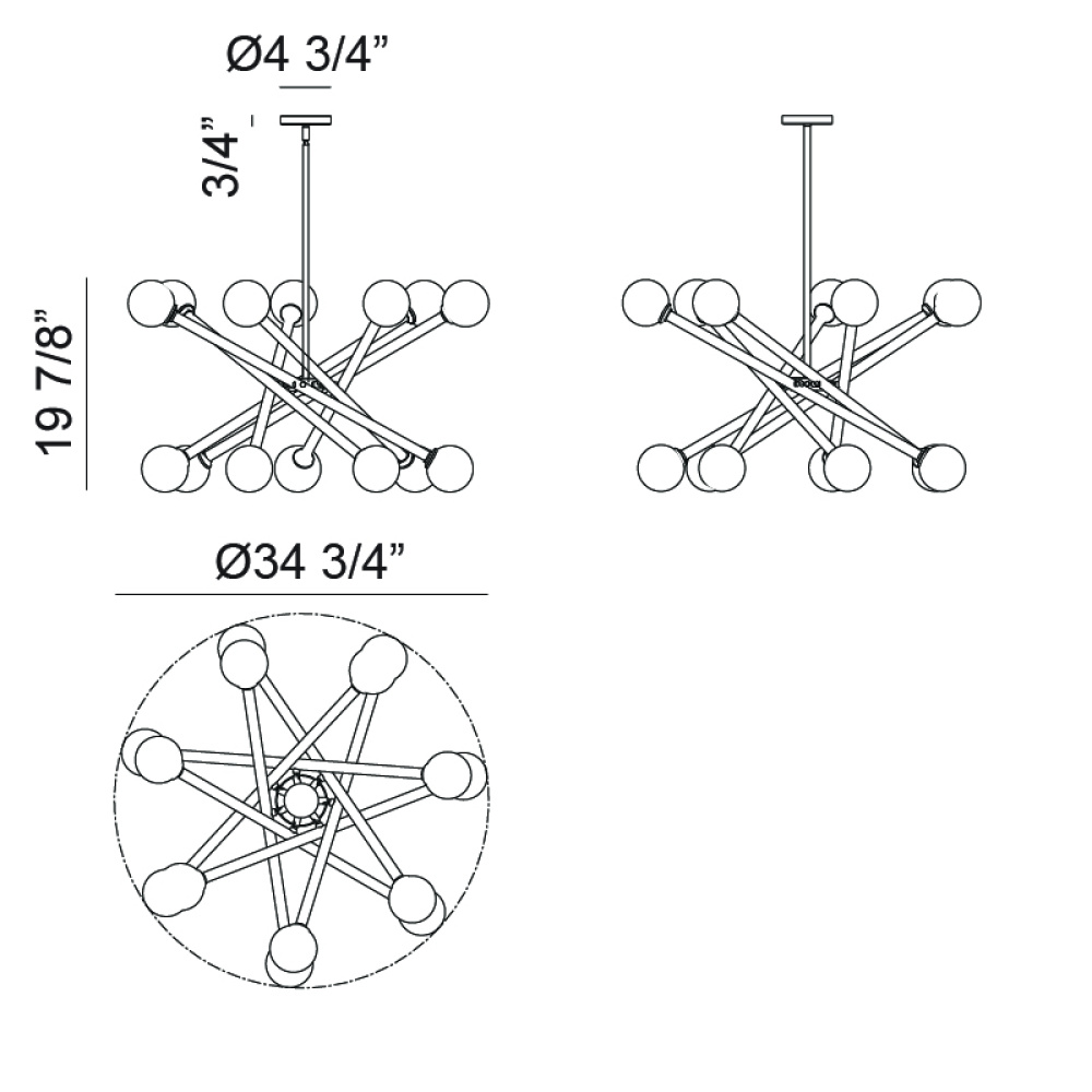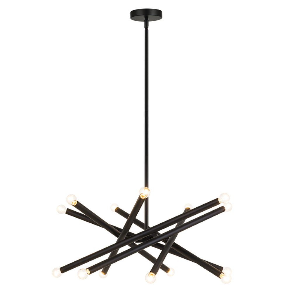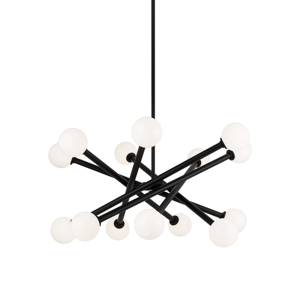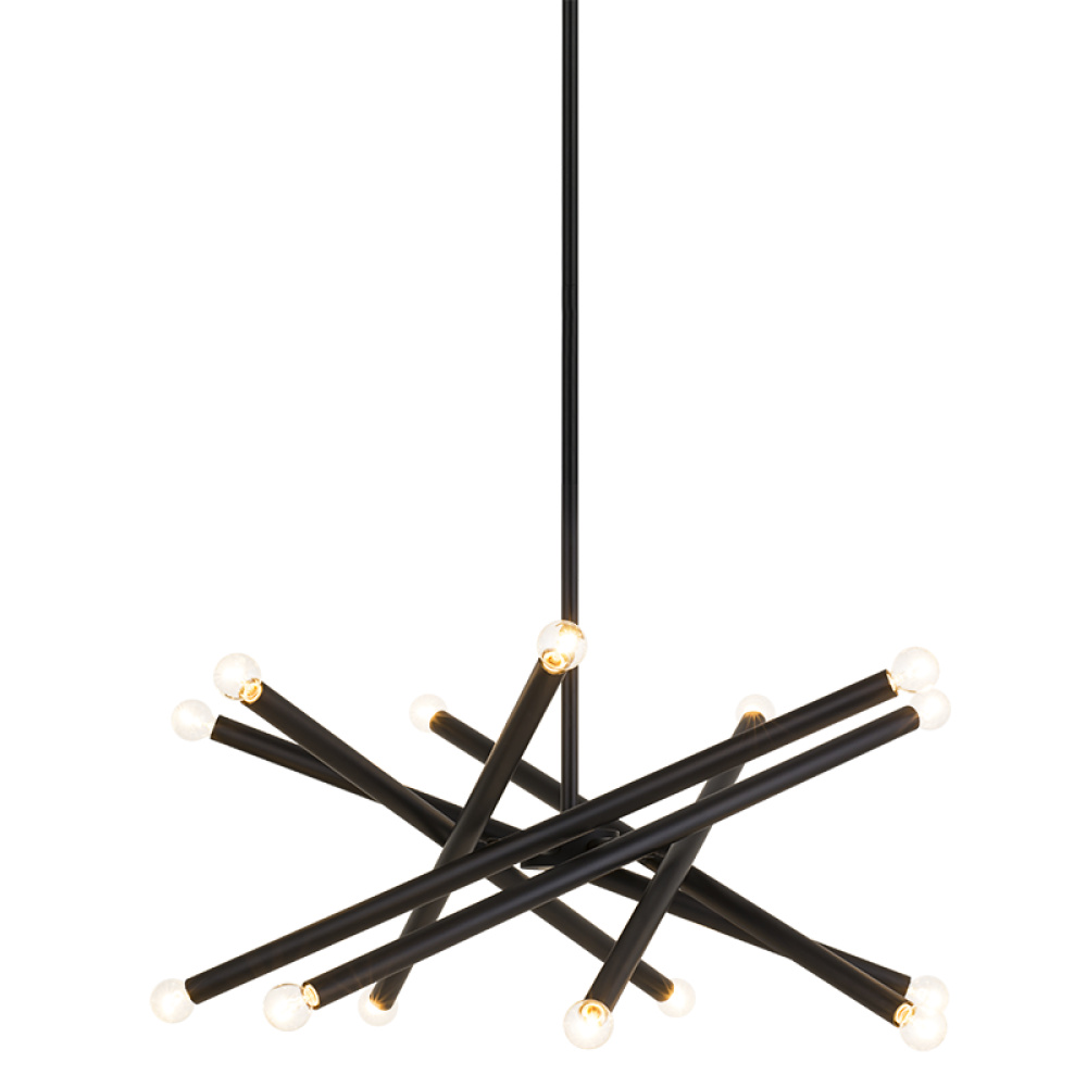 Matchstix chandelier will be a dramatic addition to any room. Modern movement in the crossing bar design will be a signature piece. Available in Aged Gold Brass or Black with either Clear or Opal glass.