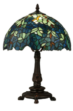 Capture the tranquility of a garden stroll at nightfall with this Nightfall Wisteria accent lamp by Meyda Tiffany. Imagine wandering under darkening skies; past the deepening blooms and climbing vines of the wisteria shrubbery; as you prepare for a restful night of welcome slumber. This beautiful accent lamp; created with blue; blue/green and green art glass using the copperfoil construction process made famous by Louis C. Tiffany in the early 20th century is a masterpiece to be proudly displayed and privately enjoyed in any home or interior setting.