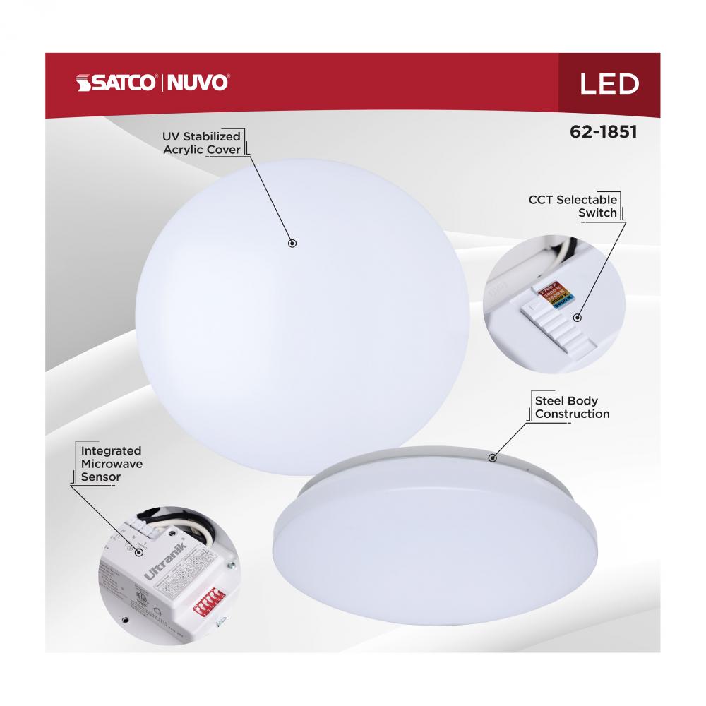The SATCO NUVO 62-1851, 11-inch round LED Cloud fixture, offers versatile 5 CCT selectable technology and a high 90 CRI rating for exceptional, uniform illumination. Designed with a durable, non-yellowing PMMA lens, it is rated for damp locations, making i