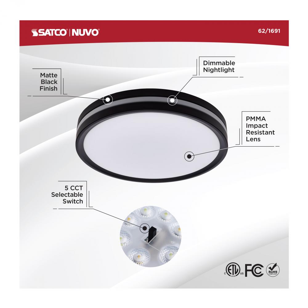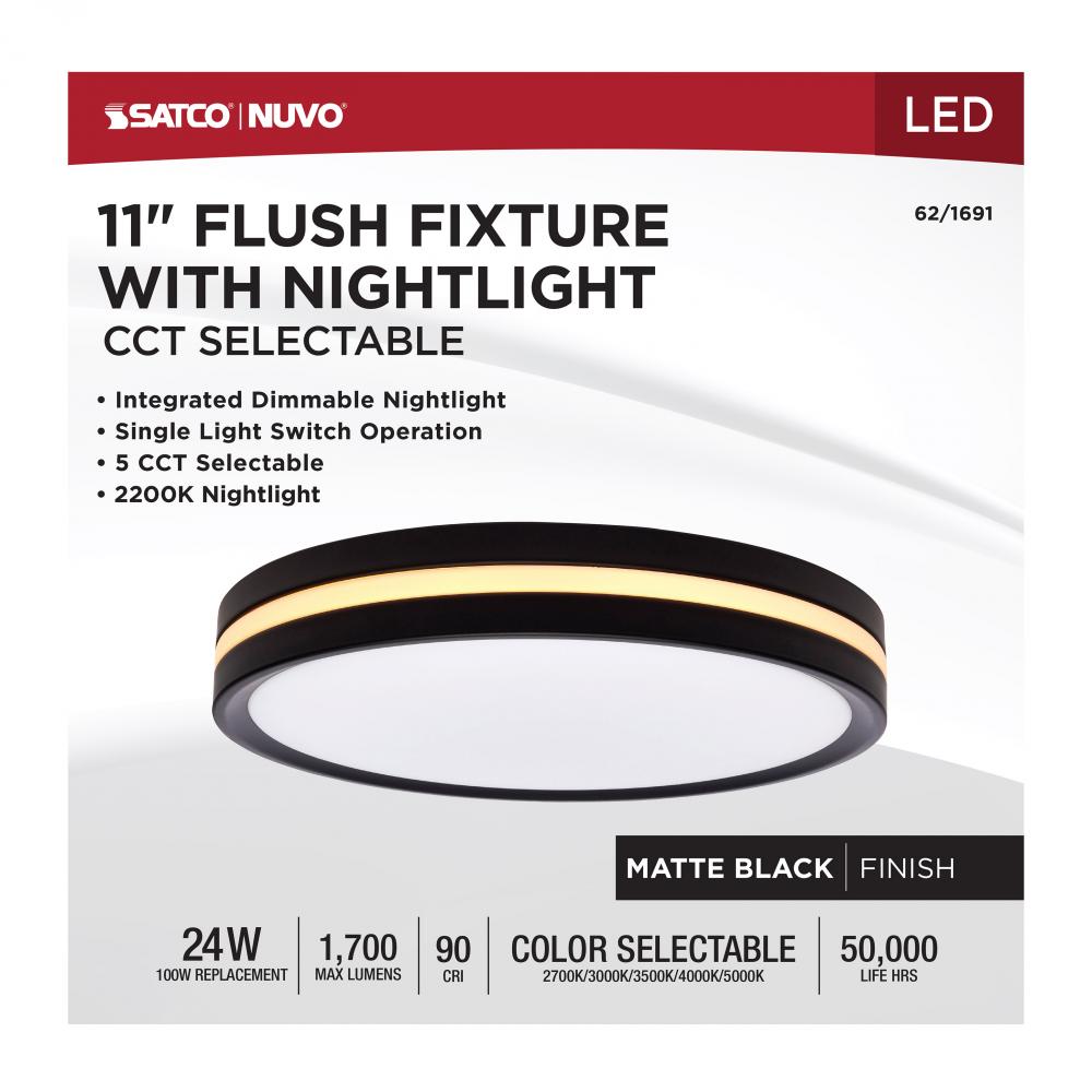 Illuminate your space with SATCO NUVO's 62-1691 Flush Mount Fixture featuring a built-in nightlight that is 11 inches with a Matte Black finish. Enjoy the convenience of clear 90 CRI lighting from a classic flush mount fixture, but with the added benef
