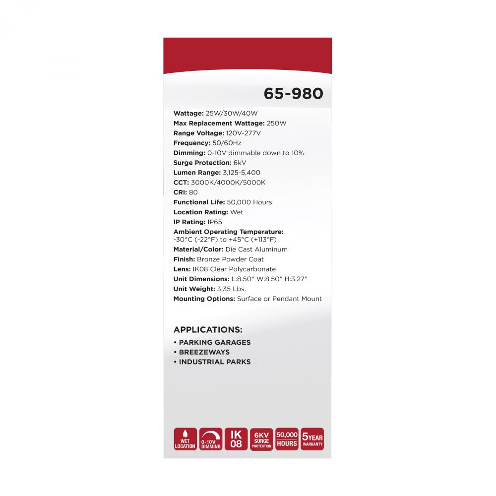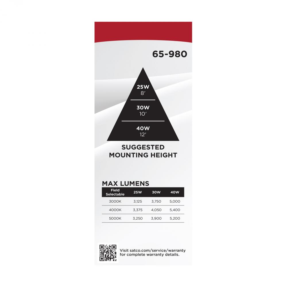SATCO NUVO's 65-980 Field Selectable 8.5 inch square canopy fixture is an ideal choice for multiple applications. This fixture gives users the flexibility to choose from three wattage and three CCT options during installation. With a choice of surface