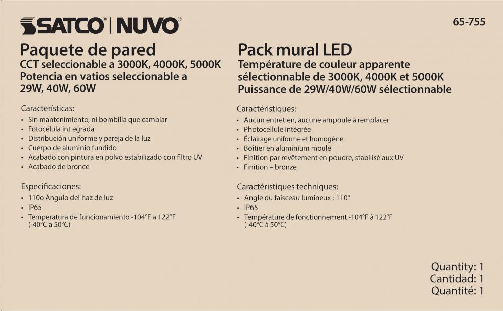Introducing 65-755, SATCO NUVO's new CCT and Wattage selectable wall pack with integrated bypassable photocell. This cULus certified wall pack is offered in a traditional style with 29W/40W/60W wattage configurations, CCT selectable temperatures of 300