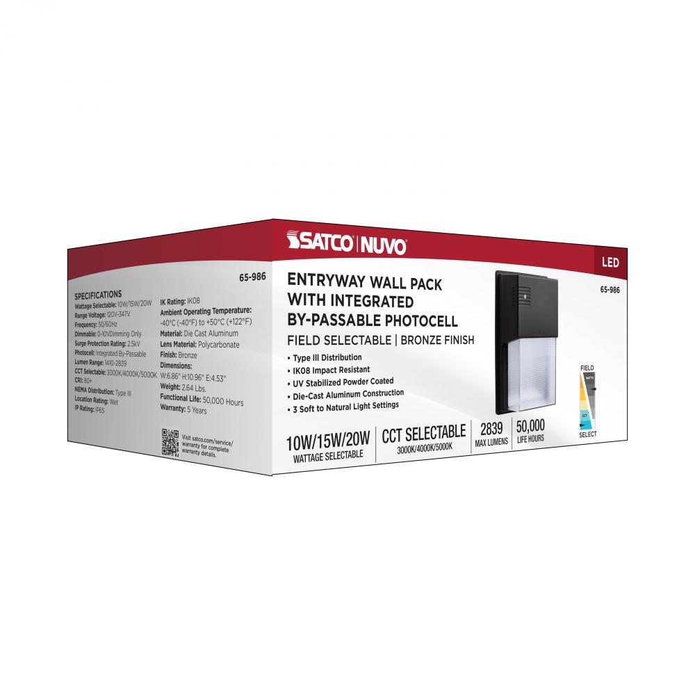 LED Entryway Wall Pack; 10/15/20 Wattage Selectable; 30K/40K/50K CCT Selectable; Bronze Finish