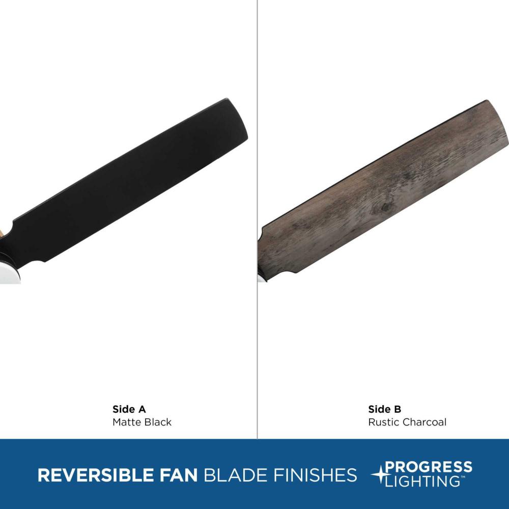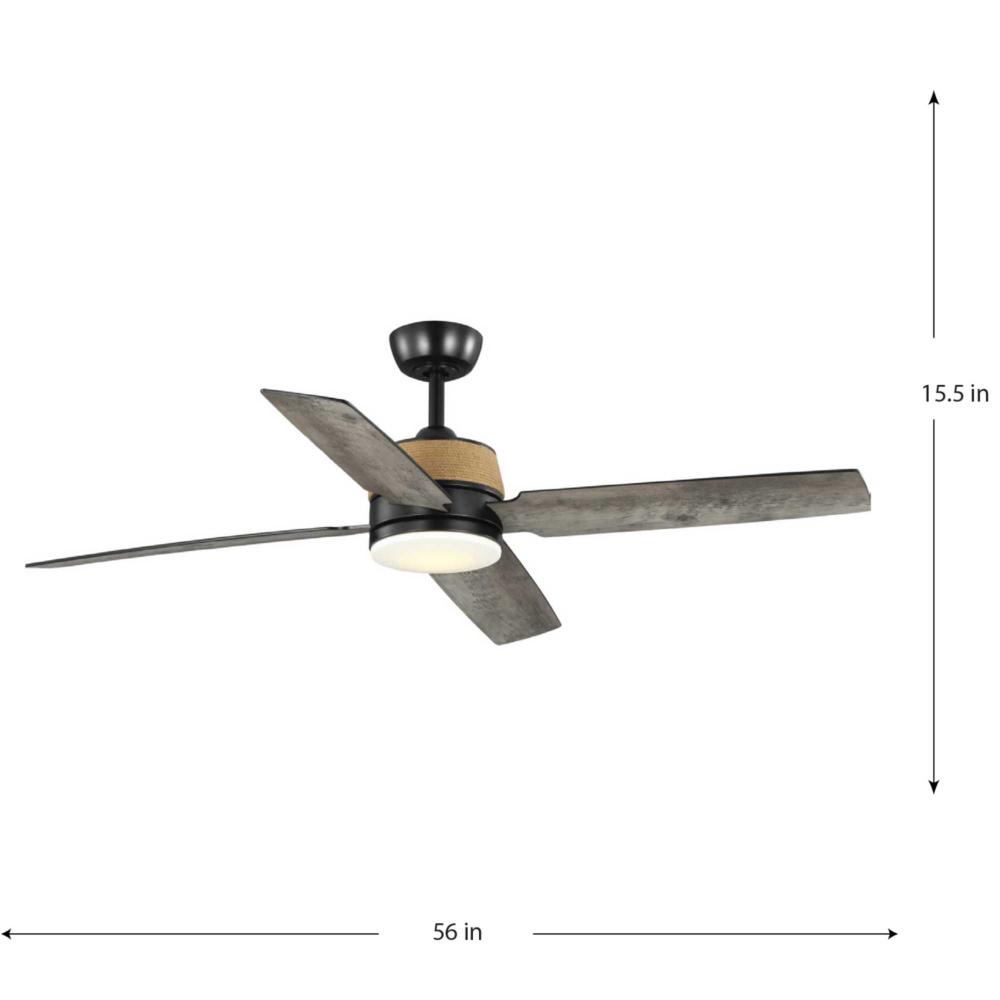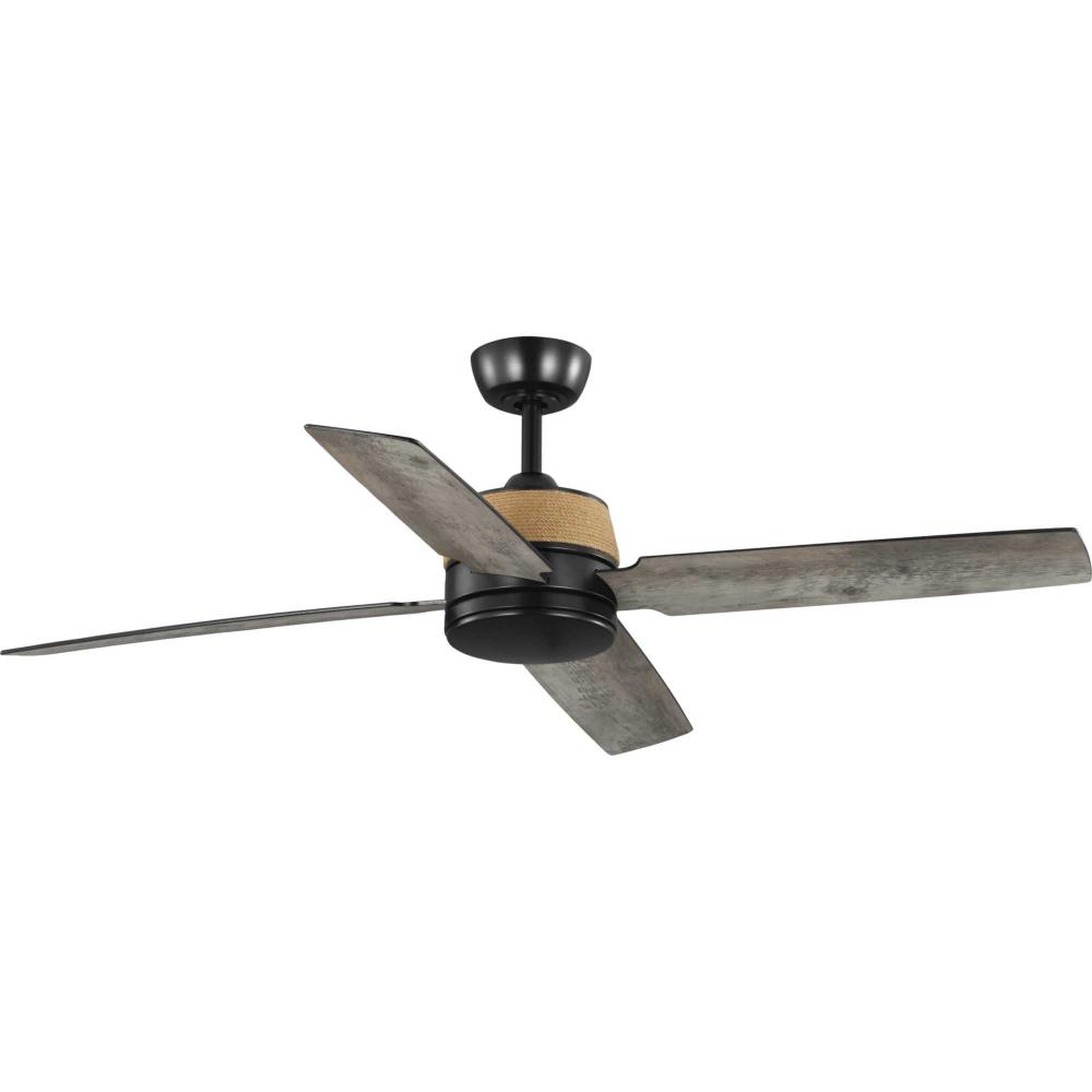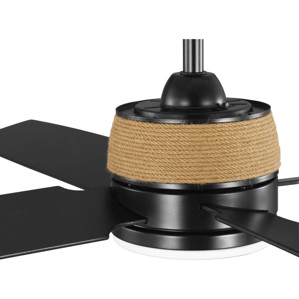 The fan is finished in matte black and accented by an organic jute rope with four reversible blades coated in a lovely rustic charcoal and matte black finishes