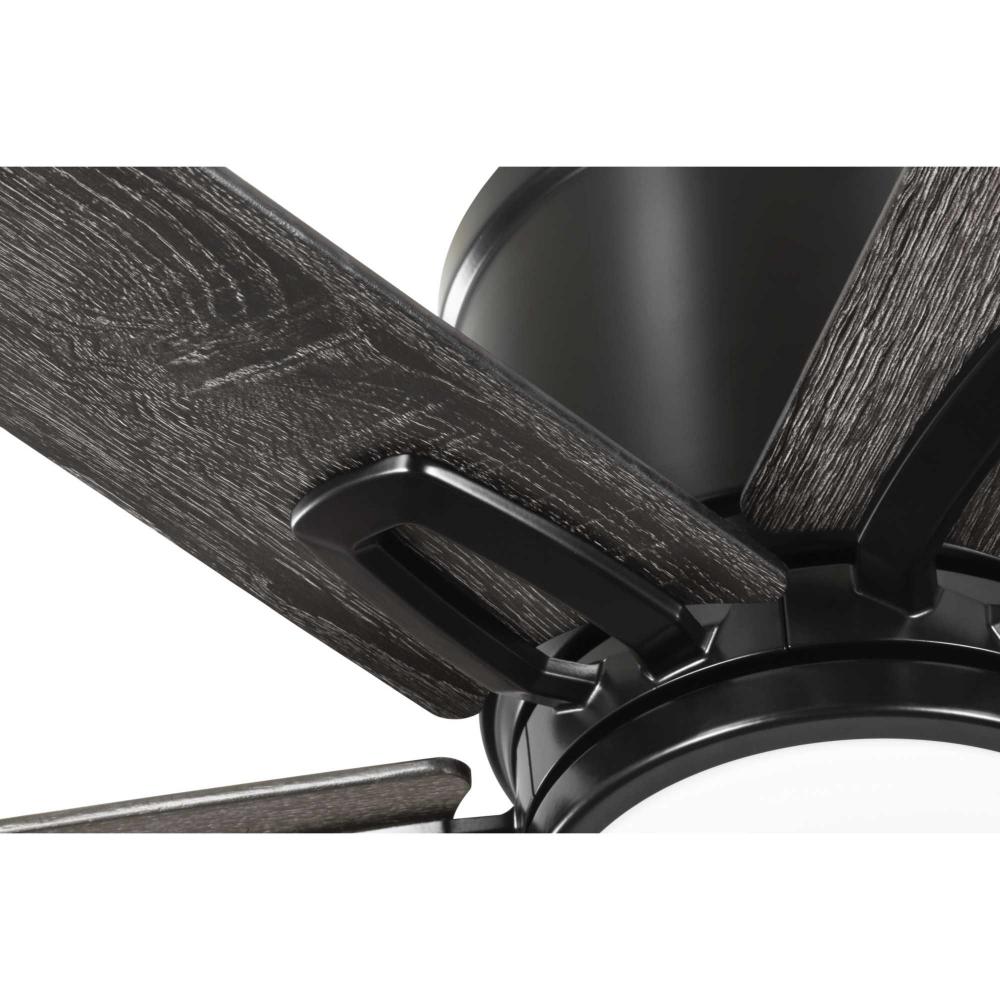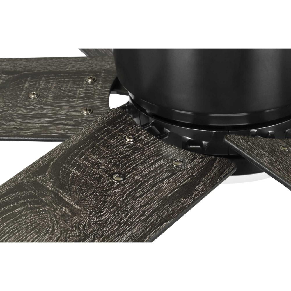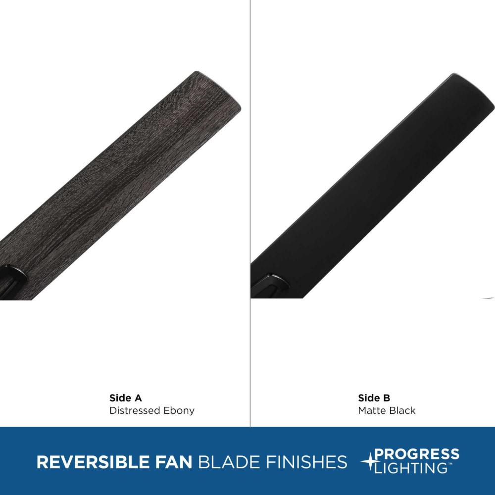 The fan is finished in crisp matte black and features six reversible blades coated in distressed ebony and matte black finish