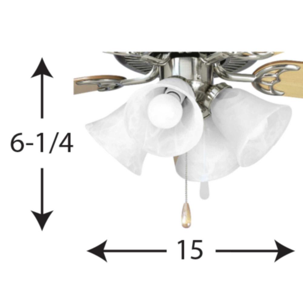 Four-light kit with white washed alabaster style glass shades beautiful in design. Innovative spring clip glass attachment system eliminates unsightly excess hardware. Good for use with P2500 and P2501 ceiling fans and includes quick connector for easy wiring. Includes four 3000K, 800 lumen each (source), Title 24 certified LED bulbs. Brushed Nickel finish.