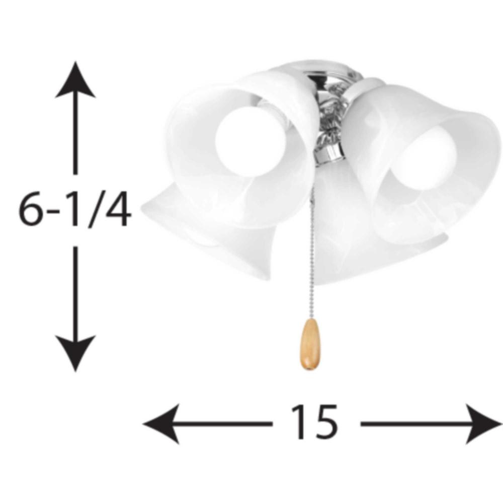 Four-light kit with white washed alabaster style glass shades beautiful in design. Innovative spring clip glass attachment system eliminates unsightly excess hardware. Good for use with P2500 and P2501 ceiling fans and includes quick connector for easy wiring. Includes four 3000K, 800 lumen each (source), Title 24 certified LED bulbs. Polished Chrome finish.