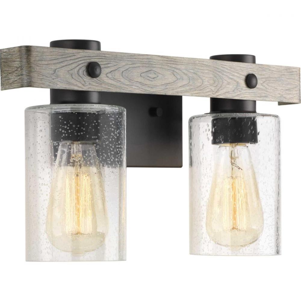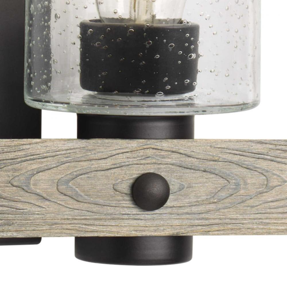 Ideal for a bathroom and powder room.;Perfect for coastal, farmhouse, rustic, and urban industrial style settings;Gorgeous graphite finish with faux painted weathered driftwood accents;Rustic clear seeded glass shades;Mount the light fixture facing up or d