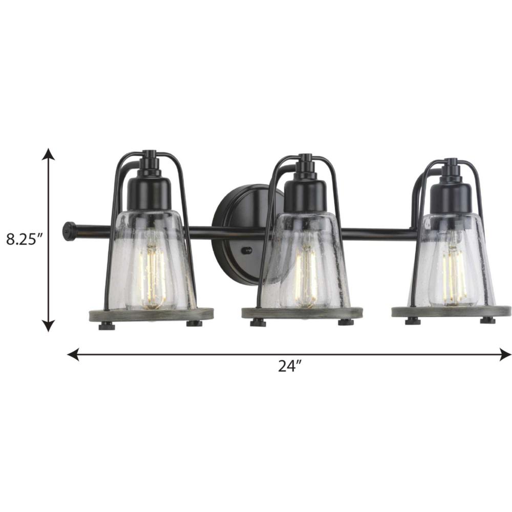 Mix old and new for charming character with the Conway Collection 3-Light Matte Black Clear Seeded Farmhouse Bath Vanity Light. A matte black bell-shaped frame and round backplate are accented by hand-painted, weathered grey wood-style accents for a charming nautical aesthetic. A light source glows from within a clear seeded glass shade for visual texture.