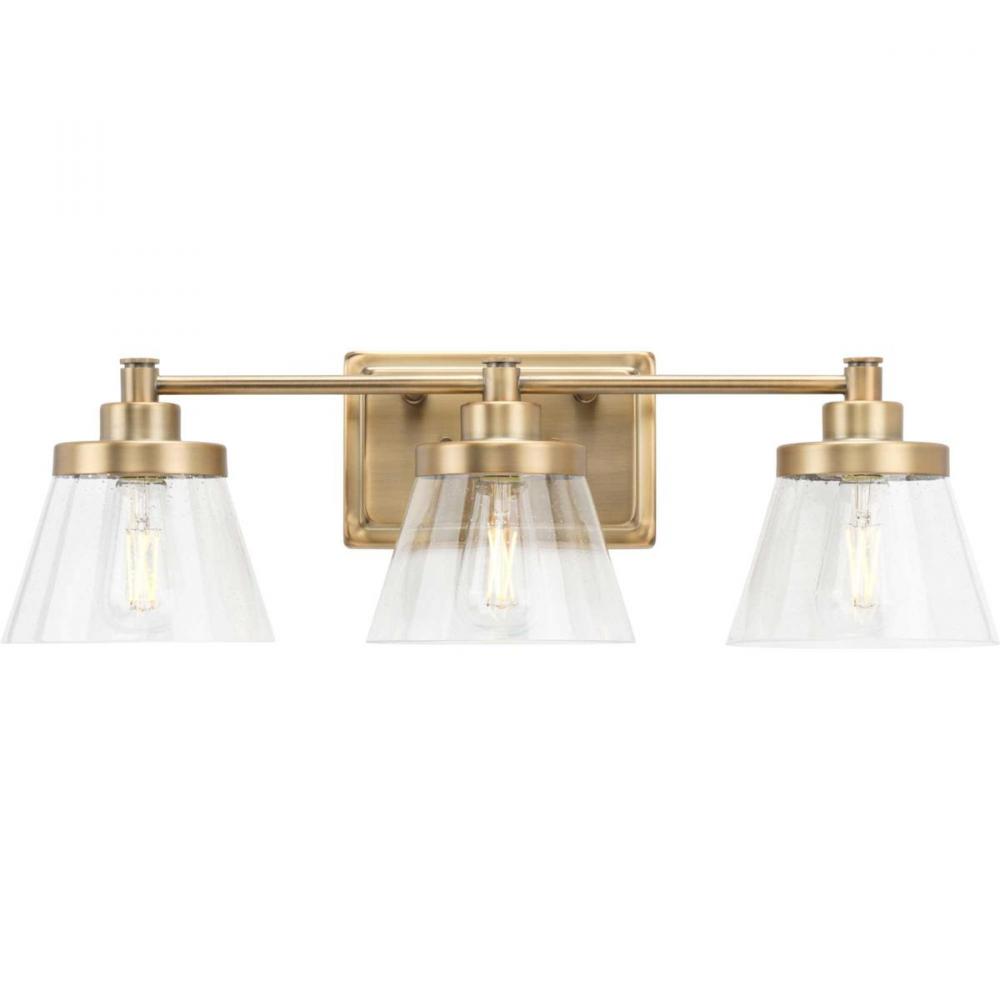 Ideal for a bathroom;Perfect for farmhouse and transitional style settings;Golden vintage brass finish;Clear seeded glass;Mount the light fixture facing up or down;Uses 3 medium base base bulbs that are sold separately (60 W max - LED/CFL/incandescent);Mea
