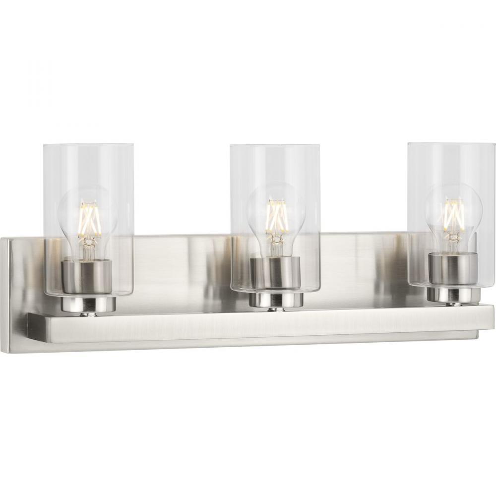 Update any bathroom with the Goodwin Vanity Light, whose clean design seamlessly blends with todays modern decor. Finished in subtle brushed nickel, its crisp lines highlight the modern profile of the rectangular backplate that supports columns of clear glass shades for bright illumination in the bath. This versatile fixture can be mounted with glass facing up or down, casting even illumination in any setting.